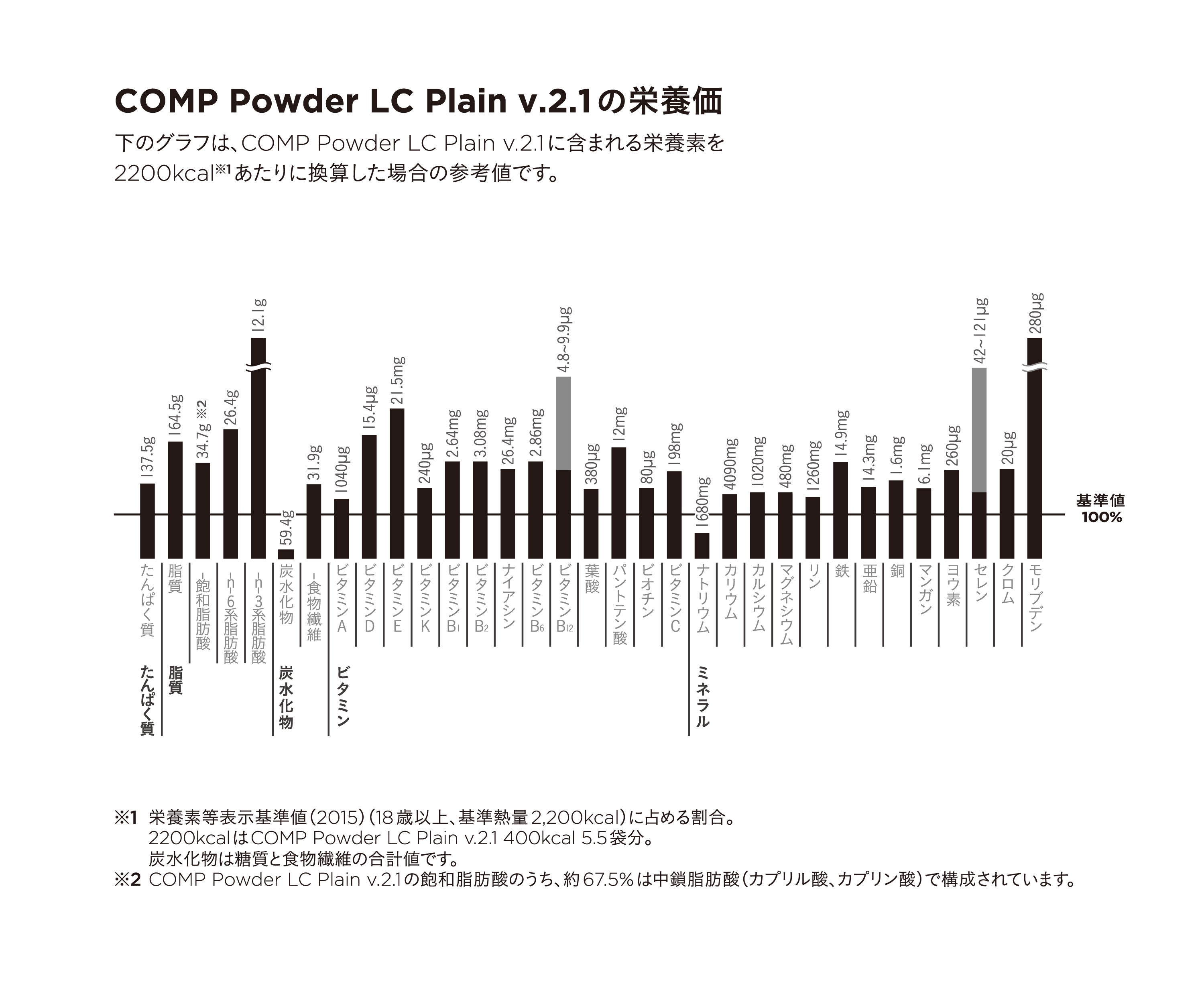 *COMPでは厚生労働省『日本人の食事摂取基準 (2020年版)』において定められているエネルギー必要量と栄養素の摂取量に関連する指標(推定平均必要量、推奨量、目安量、耐用上限量、目標量)、並びにそれらに関連する記述等を参考として独自の基準(18歳以上の成人を対象)を設けており、外部の分析機関での栄養成分分析を行っています。