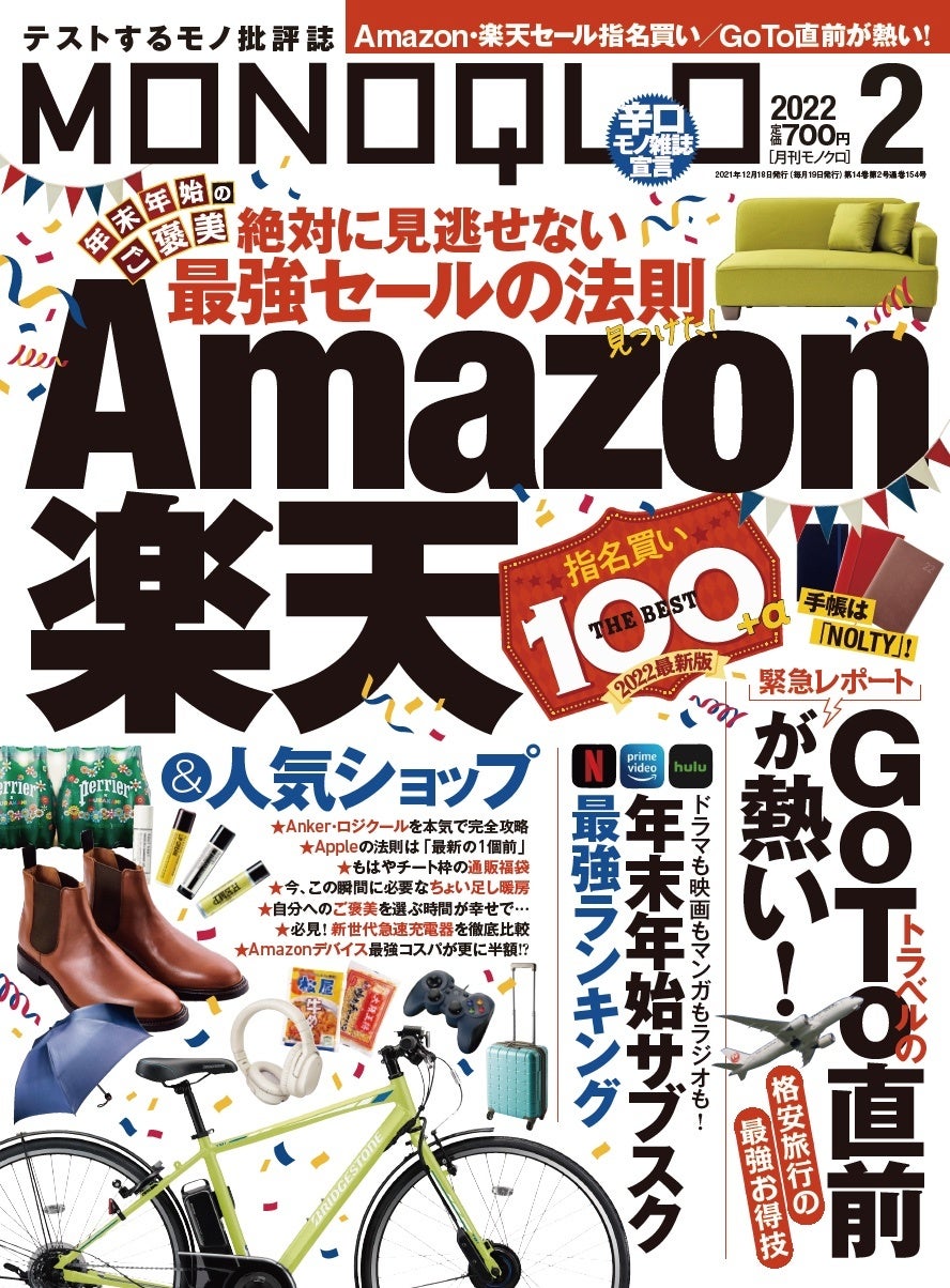 2月号では、年末年始のセールシーズンを100倍楽しめる「Amazon・楽天指名買いTHE BEST 100+α」を大特集! プロジェクターやPC機器、コーヒーメーカーや人気カメラ、さらには通常は値下がりしにくいApple製品まで、欲しいモノを確実にお得に手に入れることができるセールの法則をお教えします。そのほかにも、Go To トラベル&格安旅行大攻略「国内旅行完全ガイド2022最新版」では、知らなきゃもったいないお得技を徹底解説。いつもより断然お得に旅行ができる裏技を大公開しています! 本リリースでは、編集部が“本当におすすめできる”製品の⼀部をご紹介します。
