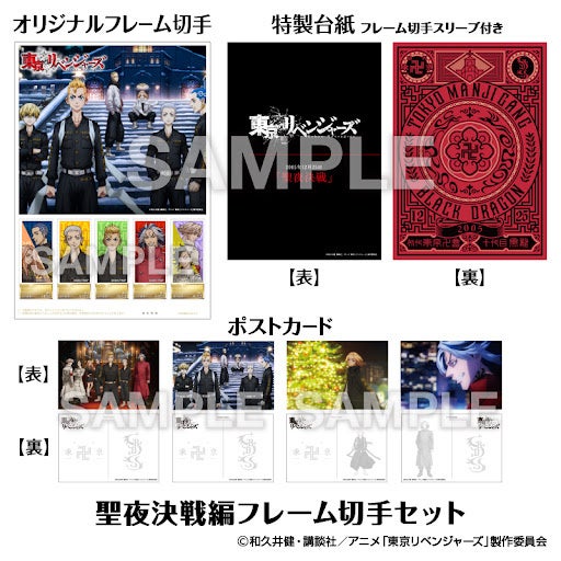 「聖夜決戦編」のビジュアルを使用したフレーム切手、「東京卍會VS黒龍」オリジナルアートを使用した特製台紙、キービジュアルの他にマイキー、 大寿のポストカードを揃えた豪華セットです。