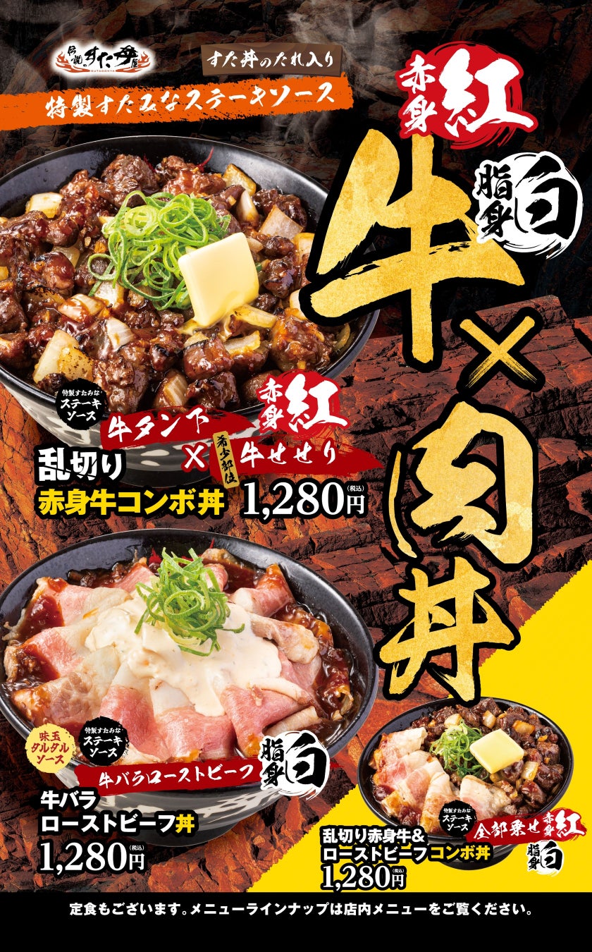丼チェーン「伝説のすた丼屋」「名物すた丼の店」を運営する株式会社アントワークス(所在地:東京都杉並区、代表取締役社長:早川 淳)は、2024年12月2日(月)より『乱切り赤身牛コンボ丼』『牛バラローストビーフ丼』『乱切り赤身牛&ローストビーフコンボ丼』を全国の店舗(一部店舗を除く)にて期間限定で販売いたします。
