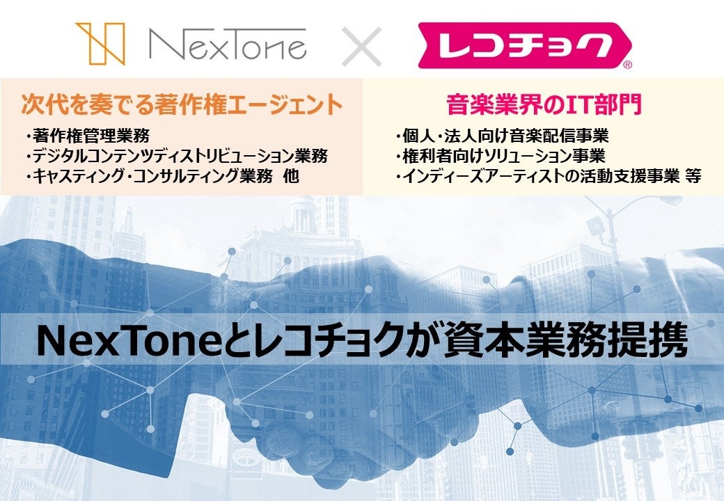 NexToneとレコチョクは両社の企業価値向上のため、楽曲管理の拡大、インディーズアーティストの発掘、活動支援、さらにデジタル技術を駆使した新規ビジネスの創出、システム開発・保守・運用の効率化、システムエンジニアや営業チーム等の連携を行い、両社の長所を生かして、事業の成長速度を加速させるとともに、音楽業界の発展にさらに寄与してまいります。