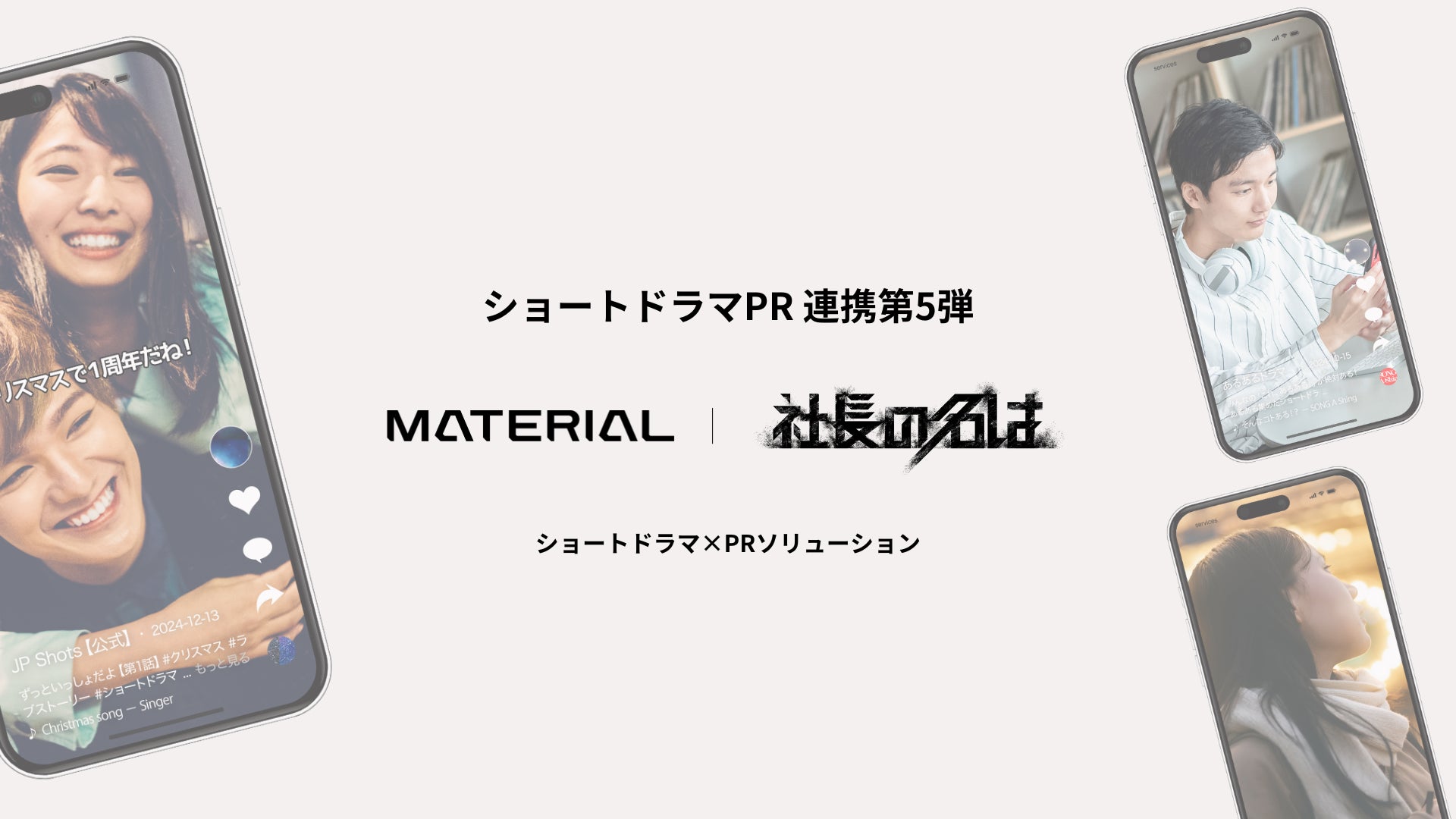 マーケティングコミュニケーションを中心にパブリックリレーションズ全般を支援する株式会社マテリアル(本社:東京都区 代表取締役社長:青﨑曹 以下:マテリアル)は、縦型ショートドラマ企画制作とPR活動支援のパッケージ「ショートドラマPR」において、ベンチャーから東証プライム企業まで、幅広い立場の社長が出演するショートドラマTikTokアカウント「社長の名は(運営会社:株式会社ctow 本社:東京都中央区 代表取締役社長:窪井 耕)」とのサービス連携を開始いたします。従来の情報設計からメディア露出まで、PR活動支援を含む総合的なコミュニケーションパッケージをクライアントに提供します。