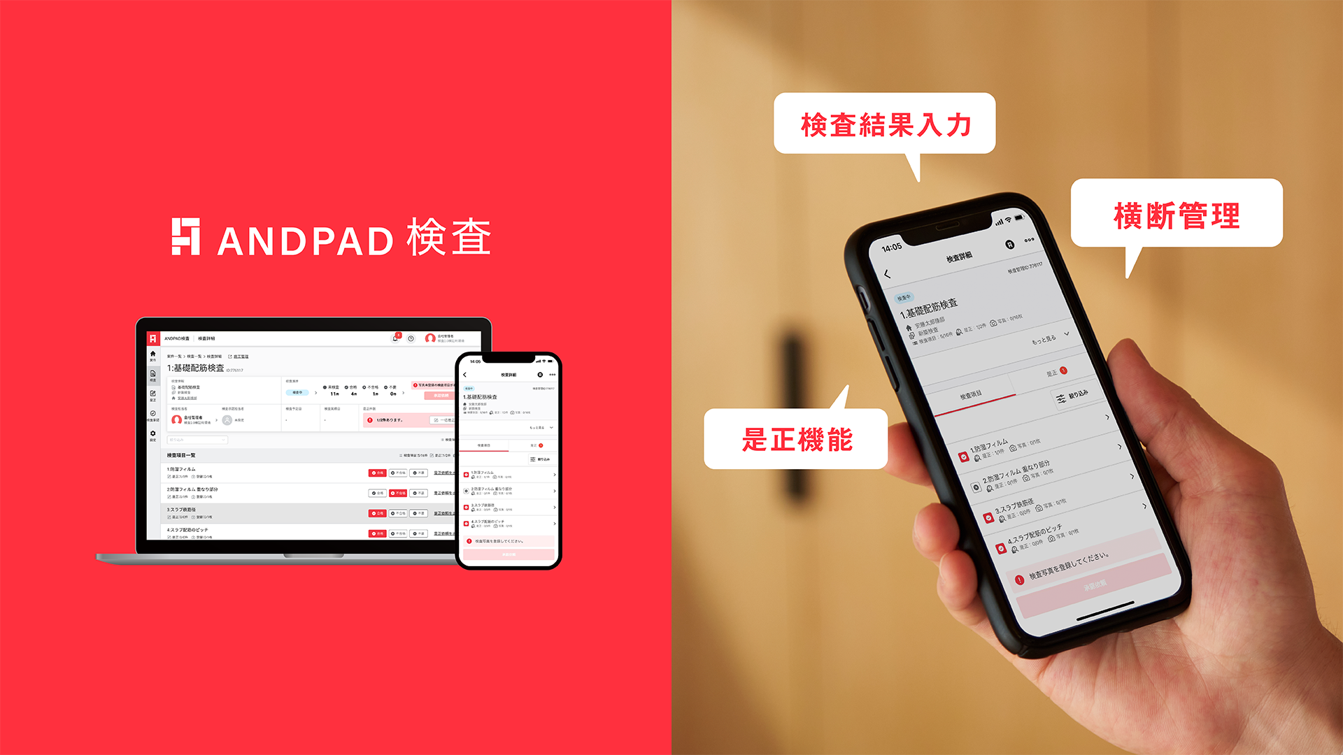 今回発表する新「ANDPAD検査」は、従来の機能である検査結果の入力に加え、是正対応状況の一元管理や現場を横断した検査の進捗把握などができるようになり、更なる検査業務の標準化と施工品質向上に繋がります。