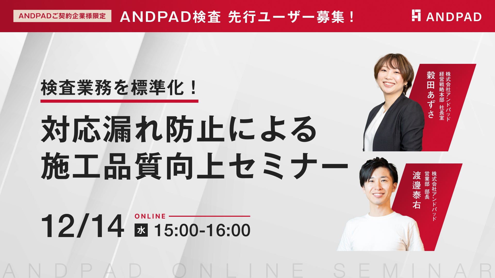 また、本ウェビナーにご参加いただいた方へ、「ANDPAD検査」を先行ユーザーとしてご利用いただけるキャンペーンをご用意しております。ぜひご参加ください。
