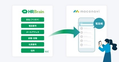 さらに、「HRBrain」上に登録されている従業員データ(部署情報・メールアドレス・電話番号など)を「moconavi」の「クラウド電話帳」機能との連携により、目的・シーンに合わせた連絡手段を選択することができ、スムーズなコミュニケーションを実現します。