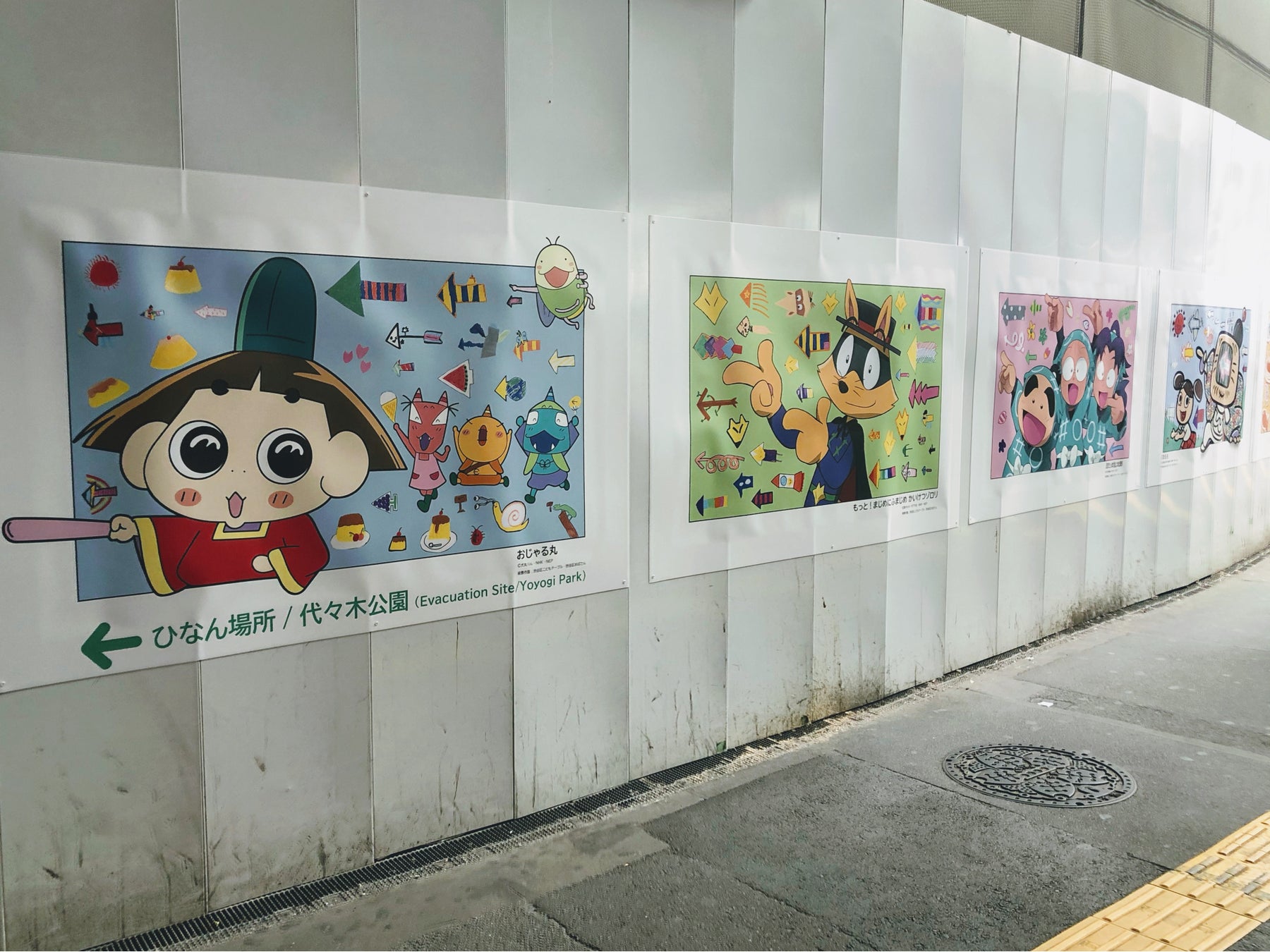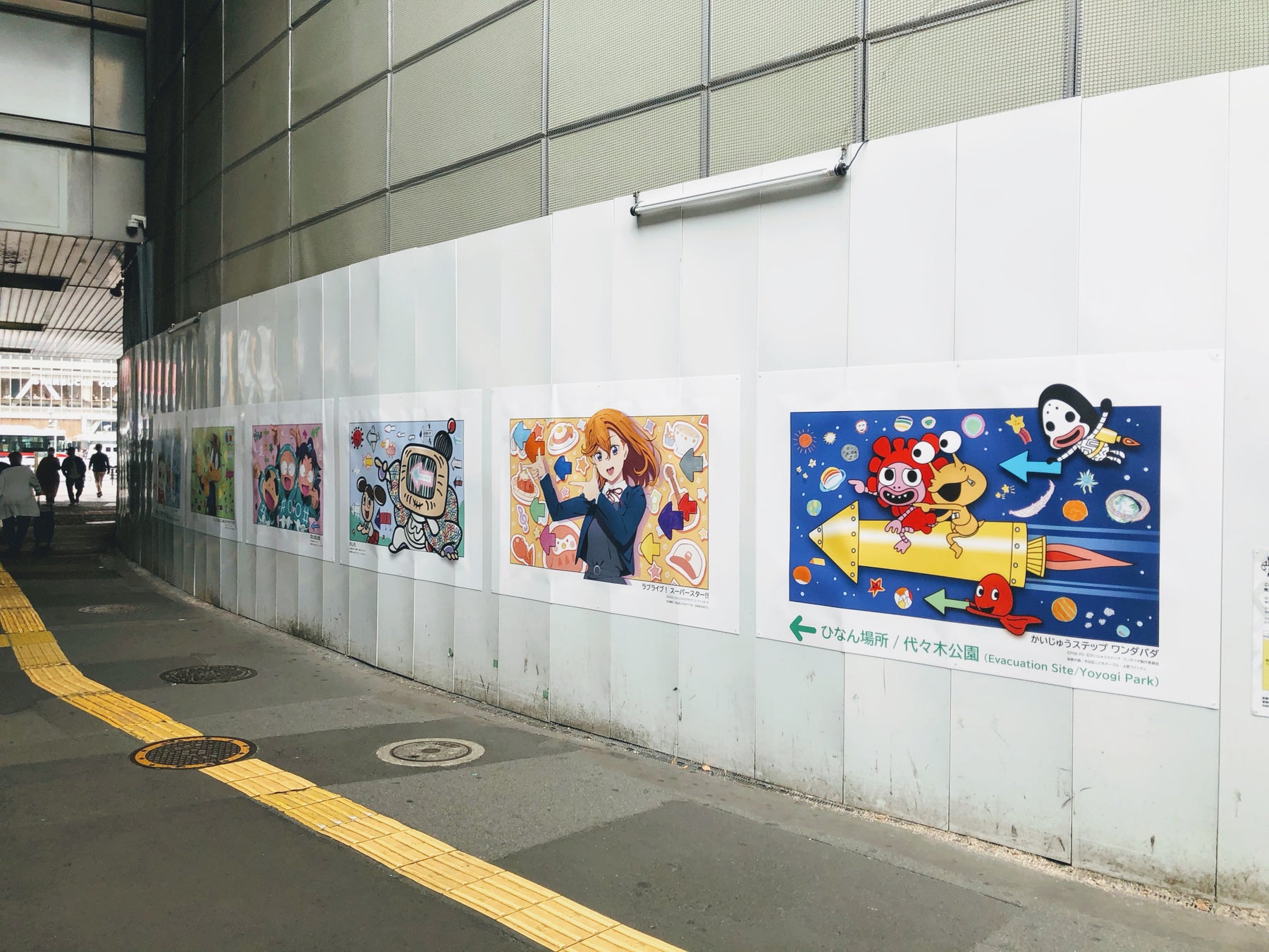 作品の掲示場所は、渋谷駅近くの東急百貨店東横店解体地区 西面地上部仮囲いで、JRと井の頭線通路の下周辺です。工事中の駅前を楽しく彩りながら、避難場所として代々木公園への方向を示しています。渋谷区により2023年3月まで期間限定で飾られる予定です。