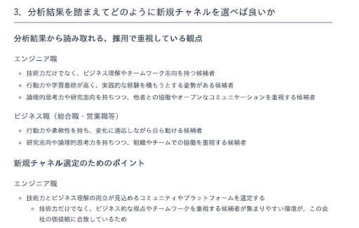 評価されている候補者の共通項(例:「技術的な好奇心が強い」「当事者意識がある」など)をAIが抽出し、「なぜ、このチャネルが自社に合っているのか」という定性的な根拠を提示します。これにより、納得感を持って新規チャネル選定や予算配分を行うことができます。