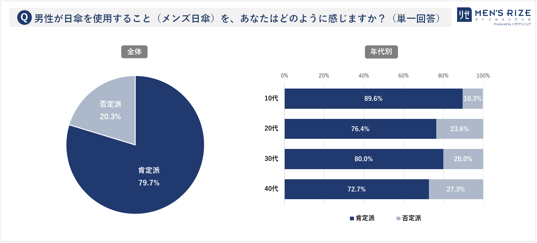 別途「男性が日傘を使用することを、どのように感じるか」の質問では、男性の8割が「メンズ日傘・肯定派(79.7%)」であり、世代別では10代男性の9割が「肯定派(89.6%)」で最多回答であることが分かりました。