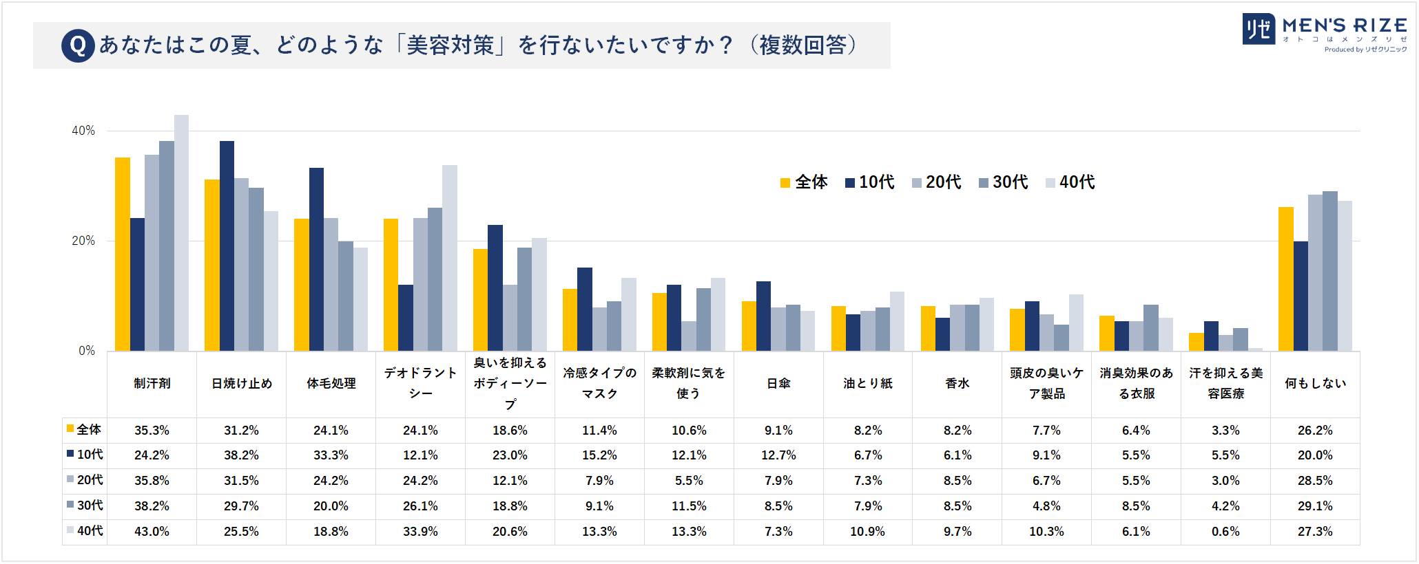 制汗剤 35%(10代:24%、20代:35%、30代:38%、40代:43%)