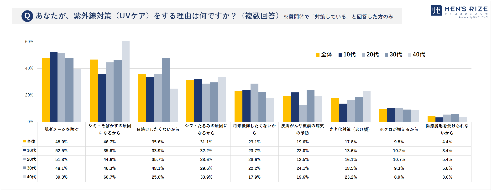 シミ・そばかすの原因になるから 46%(10代:35%、20代:44%、30代:46%、40代:60%)