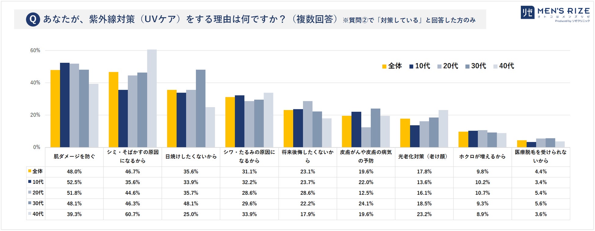 肌ダメージを防ぐ 48%(10代:52%、20代:51%、30代:48%、40代:39%)