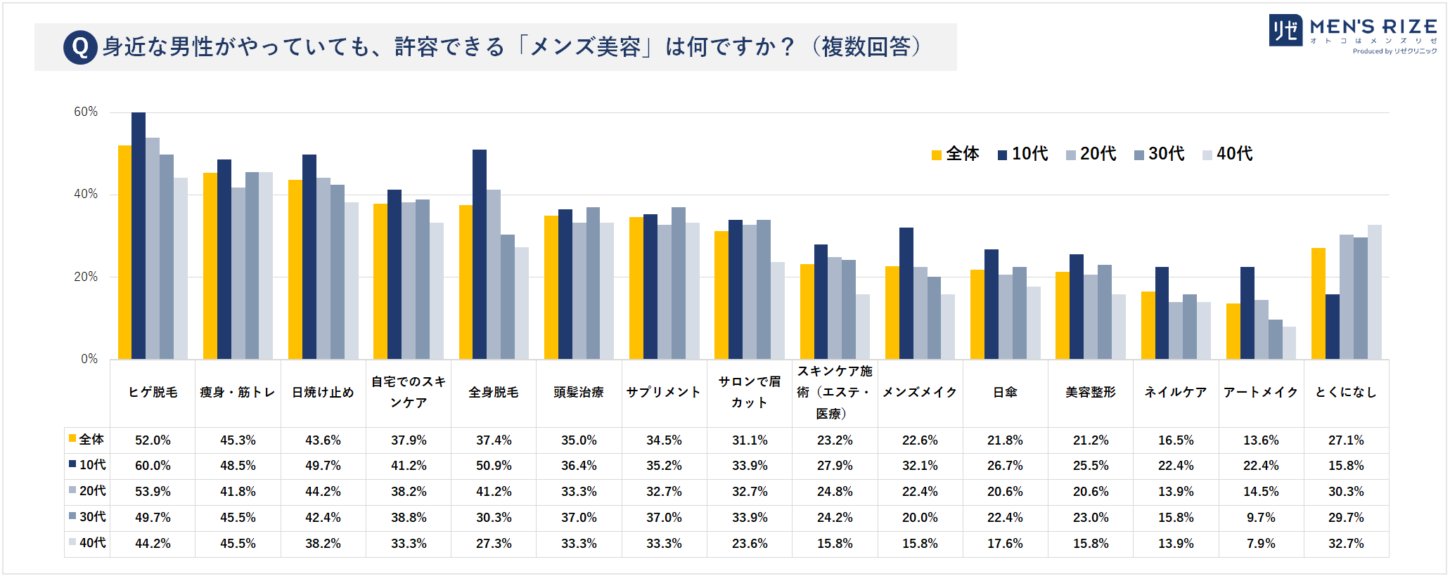 ヒゲ脱毛 52%(10代:60%、20代:53%、30代:49%、40代:44%)