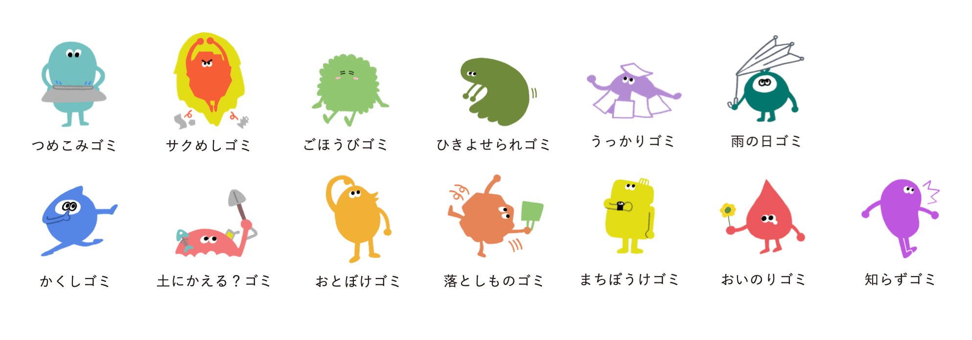 そこで、わたしたちは落ちているごみを整理・分類し、ごみを生み出してしまっている私たち1人1人の中にある「気持ち」を特定していったところ、15種類のごみにつながる『うみごme』があることがわかってきました。