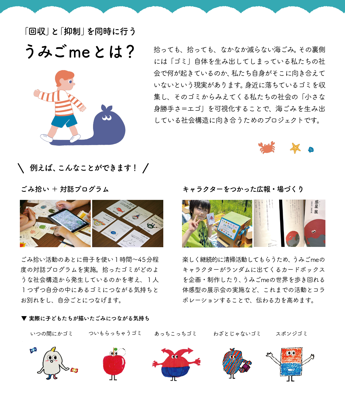 『うみごme』は、1人1人の心のなかに潜むちょっとくらいいだろうという気持ちを可視化することで、海ごみを生み出している社会と自分に向き合い、海ごみの「回収」から「抑制」へとつなげることに挑戦します。