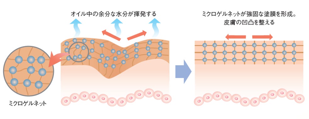 2. 肌表面に形成された立体的な膜「ミクロゲルネット」の柔軟性を強化。コルセットのように肌全体を包み込んでキープし、使うと弾むようなハリ感が感じられます。