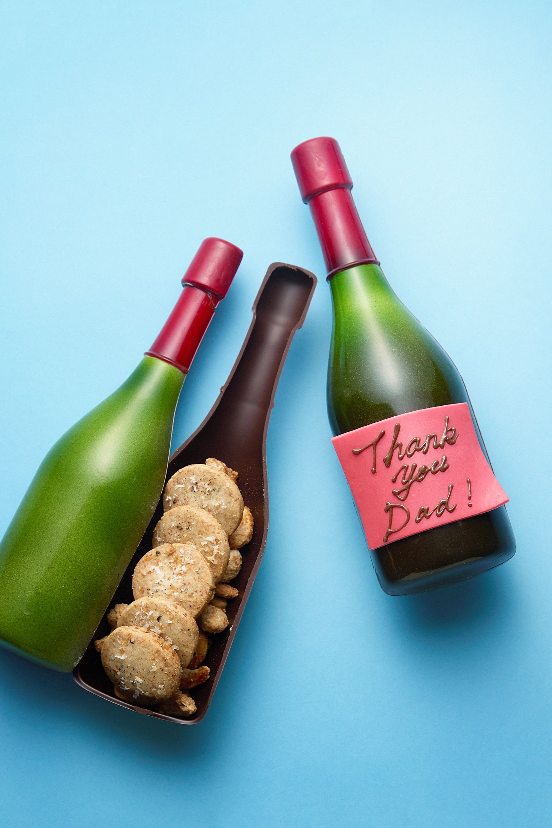 スイーツがあまり得意でないお父さんたちにも喜んでいただけるように、ワインボトル型のチョコレートもご用意いたしました。このチョコレートの中には、コンテチーズ、ローズマリー、ブラックペッパーを練り込んだ大人向けの味付けのサブレと、ほんのりとした塩気がアクセントのメープルカシューナッツが詰まっています。コンテチーズの濃厚な風味とローズマリーの爽やかな香り、ブラックペッパーのピリッとした刺激が絶妙に調和したサブレと、メープルシロップの甘さとカシューナッツのクリーミーな食感がくせになるメープルカシューナッツの、ついつい食べ進めてしまうコンビネーションです。コーヒーや紅茶と一緒におやつとしても、お酒のお供としても楽しめる一品で、お父さんのリラックス時間を贅沢に彩ります。カスタマイズしたメッセージのリクエストも承ります。