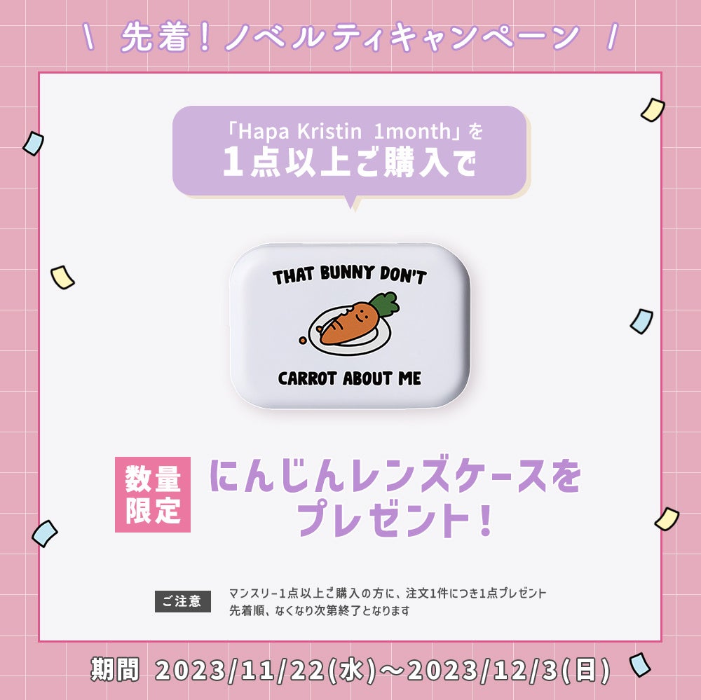 新色One&Only Kristinを含む「Hapa Kristin 1month」を1箱以上ご購入で、にんじんレンズケースをプレゼント