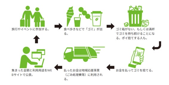 「Go!ME」とは観光地を訪れるお客様に「ごみは自宅に持って帰る」という選択肢に加え、「お金を払い、その場でごみを処分してもらう」という新しい選択肢(価値観)を提供し、環境と地域社会に貢献する事業です。株式会社JTBが事業化に向けて進めており、来訪者、地域事業者、地域住民が気持ちよく過ごせる「三方よし」で、持続可能な観光地づくりを目指すプロジェクトです。観光客にとって、訪問先での醍醐味の一つが食べ歩き。しかし、ゴミを捨てたくても近くにゴミ箱がない、もしくはゴミ箱が満杯でゴミを持ち歩かないといけない事が多々あるのが現状です。そんな時に各所に設置された「Go!ME」のごみ箱を活用し観光客参加型の地球と地域社会に貢献する事業です。