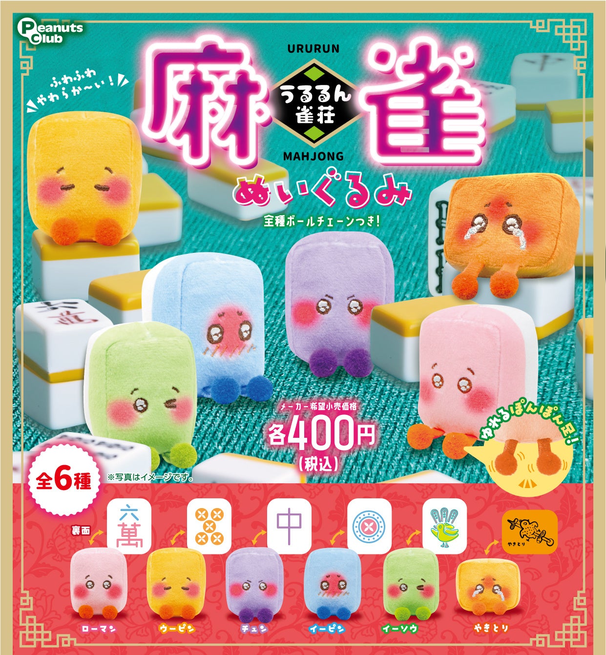 なんでもお目目をうるうるにしてしまうピーナッツ・クラブのカプセルトイのオリジナルシリーズ「うるるん」から、巷で人気の麻雀牌と焼き鳥札がぬいぐるみになって登場します。