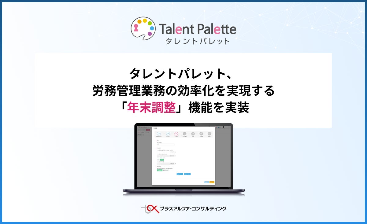 株式会社プラスアルファ・コンサルティング(本社:東京都港区、代表取締役社長:三室克哉 証券コード:4071)はデータに基づいた人事戦略の実現を目指すタレントマネジメントシステム「Talent Palette(タレントパレット)」において、労務管理業務の効率化を支援する「労務管理オプション」に、新たに「年末調整」機能を実装しました。