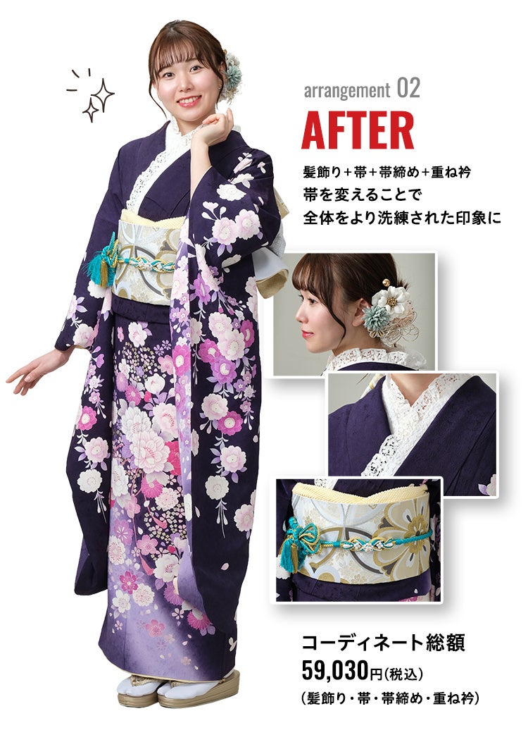まずは振袖一式をお持ちいただき、京都きもの友禅の振袖アドバイザーがお直しやお手入れの必要がないか等、点検をいたします。さらにお客様のご希望に沿って、ご家族の大切な振袖をお嬢様のイメージに合わせてコーディネートのご提案をいたします。9/24(日)までの期間限定で、振袖関連小物が全品20%OFF!小物1点からでもご購入いただけます。