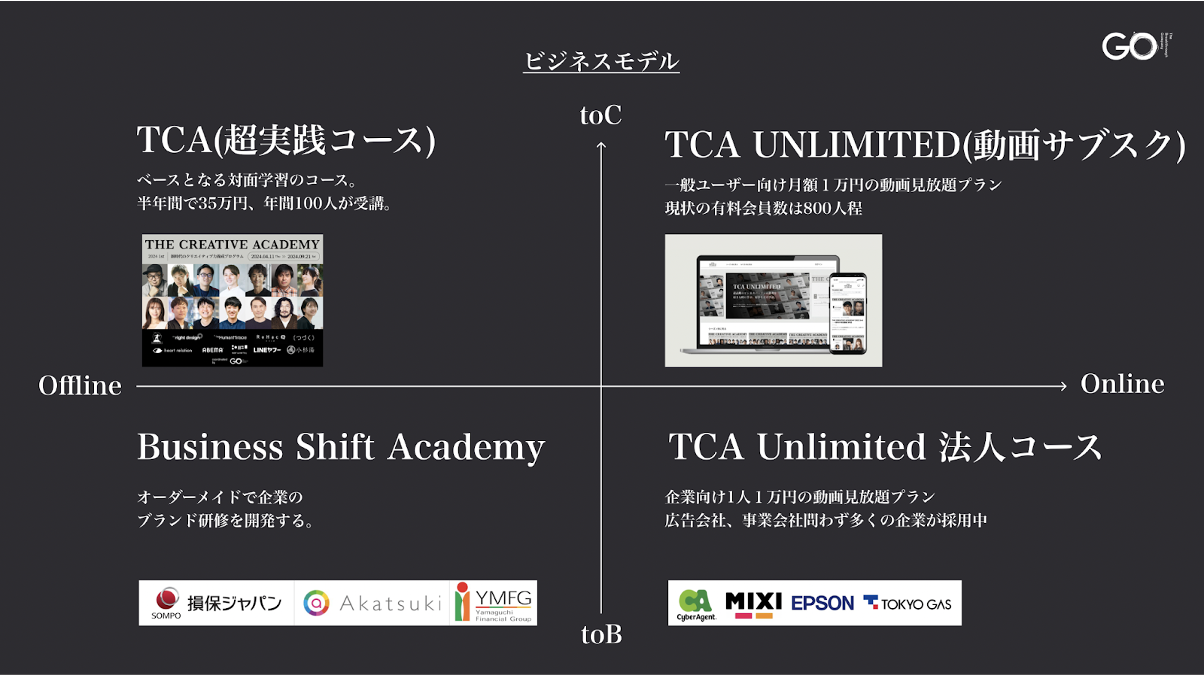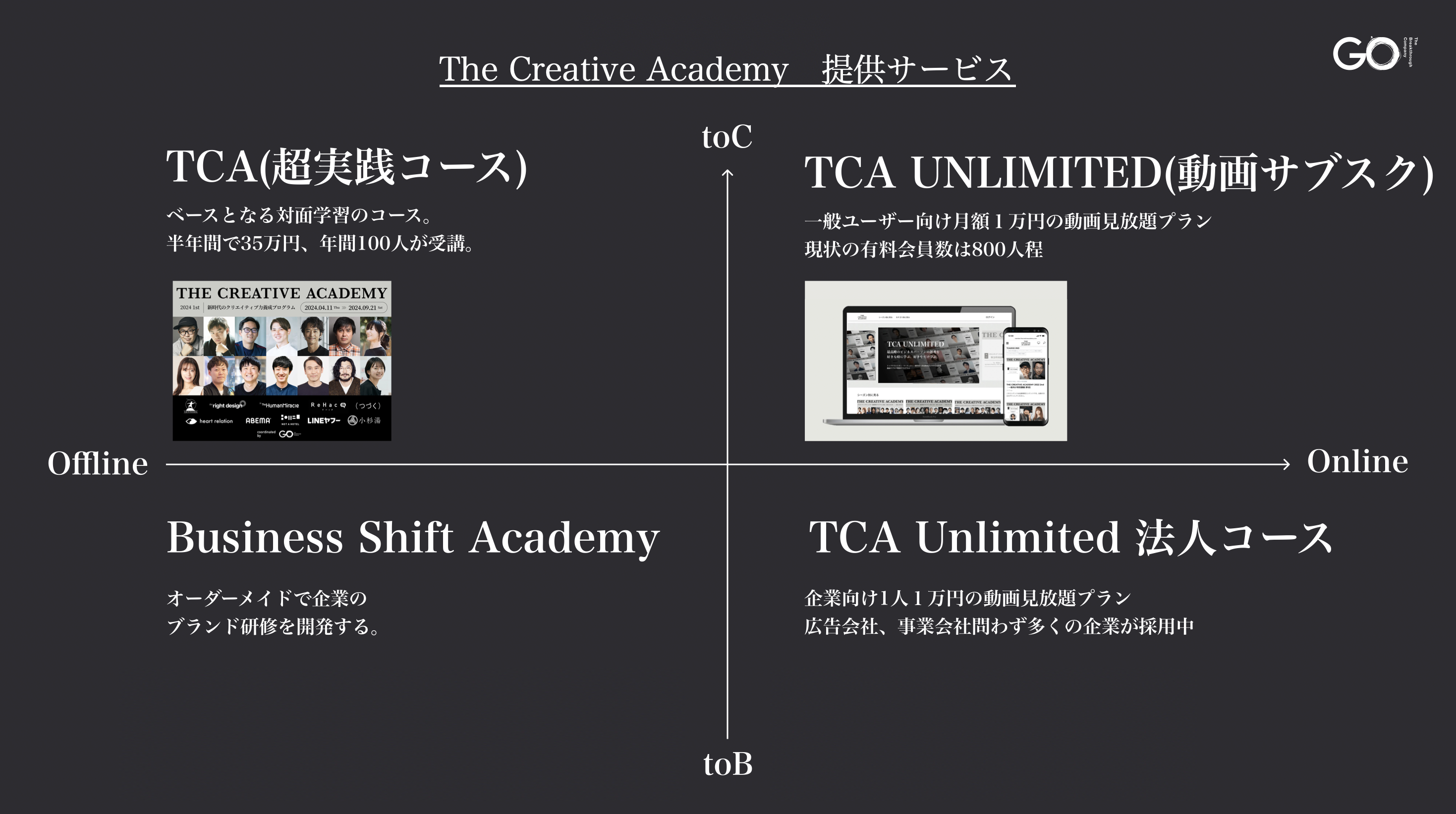 The Breakthrough Company GOは、既存事業であるクリエイティブの力による顧客の課題解決を行うソリューション事業『Creative Solution』を組織改変、ならびに新規の教育事業『The Creative Academy』に注力し、一般向けサブスクリプションサービスと法人教育プロダクトを展開していきます。