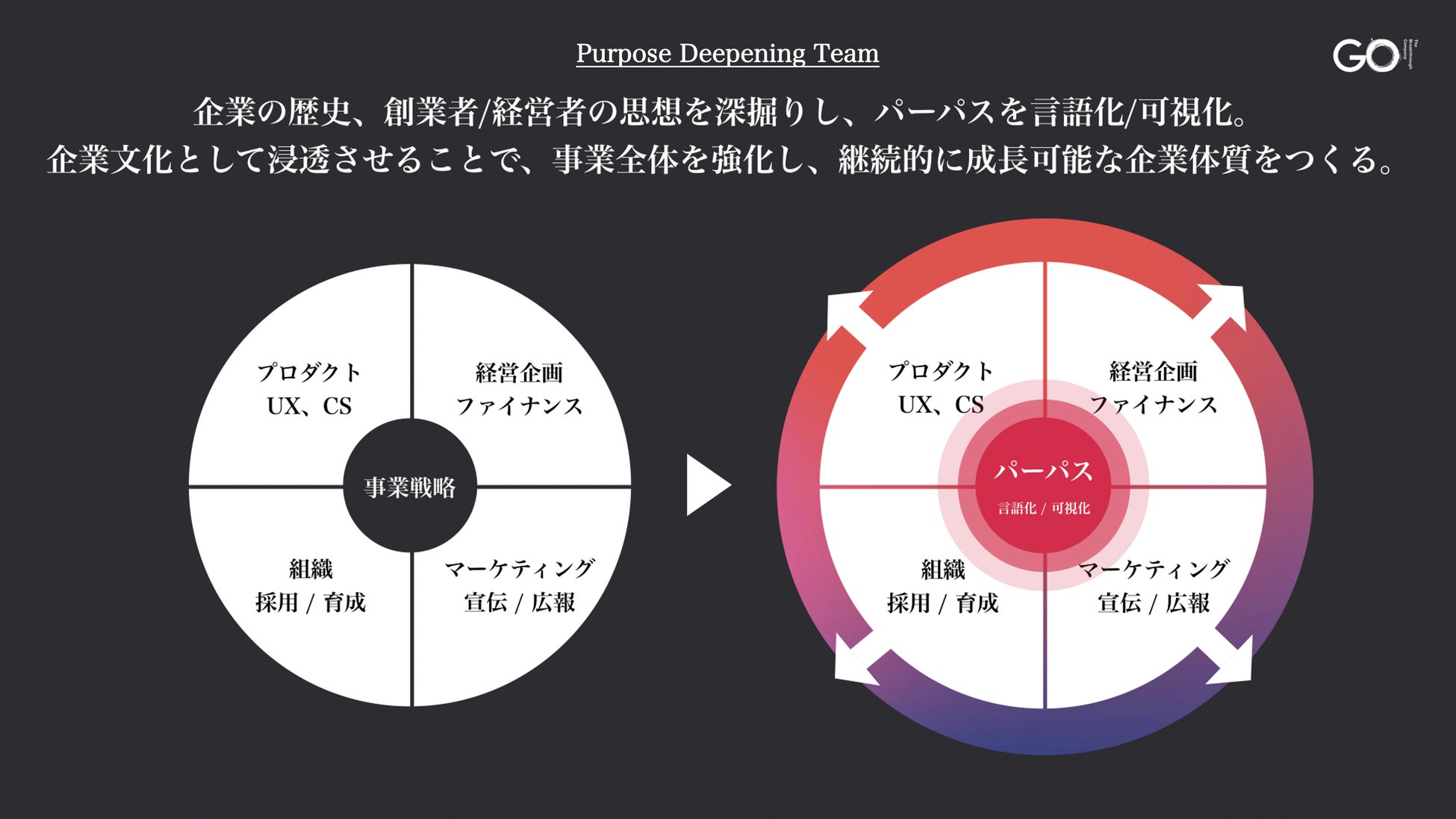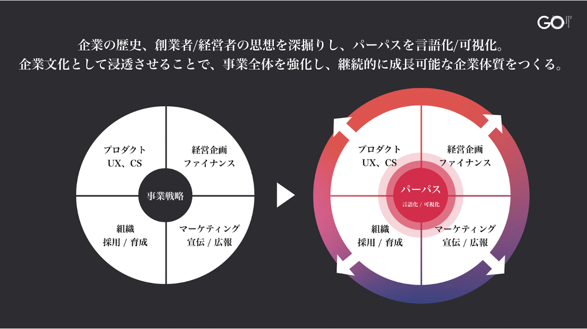 企業の歴史、創業者/経営者の思想を深掘りし、パーパスを言語化/可視化。そのパーパスを企業文化として深く浸透させることで、顧客の事業全体を強化・底上げし、継続的に成長可能な企業体質の改善を行っていく。