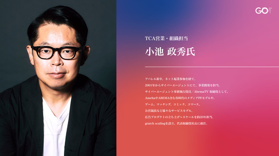 広告・クリエイティブ領域で多くのタレントを引き寄せ、自分たちなりの在り方で勢い良く成長していたGOは、以前から注目していた企業でした。そのGO三浦さんから、”あえて”同領域でない私にお声がけ頂き、企業として・事業として改めて高みにいきたいという強い意志を頂いた事で今回のご縁に至りました。サービスや事業をつくり出す仕事を長年続け、昨年から独立し、企業の事業のゼロからの立ち上げや、スケール実現に向けての伴走をしてる仕事を1つの軸としてる者として、GOが新たな成長曲線を描けるよう、様々な形で貢献していきたいと考えております。