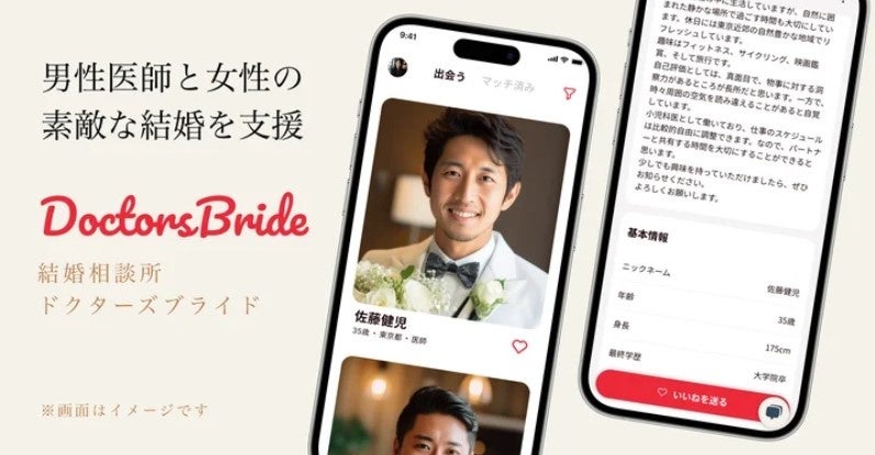 株式会社ドクターズブライドは、男性医師と一般女性をマッチングする結婚相談所「ドクターズブライド」を展開し、独自の「成婚アルゴリズム」により高精度なマッチングを行うことで、アナログな手段には頼らない現代的な婚活体験を実現しています。男性会員は医師向けの大手ポータルサイトと提携するなど独自の登録ルートにより募集しております。そのため、他の結婚相談所では出会えない、「ドクターズブライド」だけに登録する男性医師が約90%を占めております。