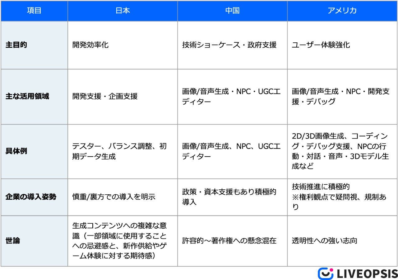 コーディングやデバッグ、運用最適化などの開発支援用途に生成AIを限定導入。著作権や労働問題への懸念から創作領域での導入は抑制的ですが、NPCの自動生成や台詞生成などプレイヤーとの自然な対話や行動を可能にするAI NPCの導入は進んでおり、そのインタラクティブ性に注目が集まっています。