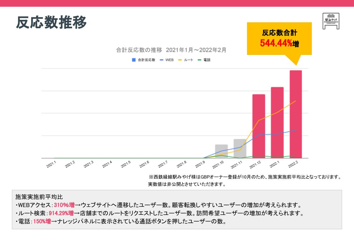 ※2 西鉄縁線駅みやげは、Googleビジネスプロフィールに登録したのが2021年10月であり、昨年同月のデータが取れないため施策前比で効果を検証しております。