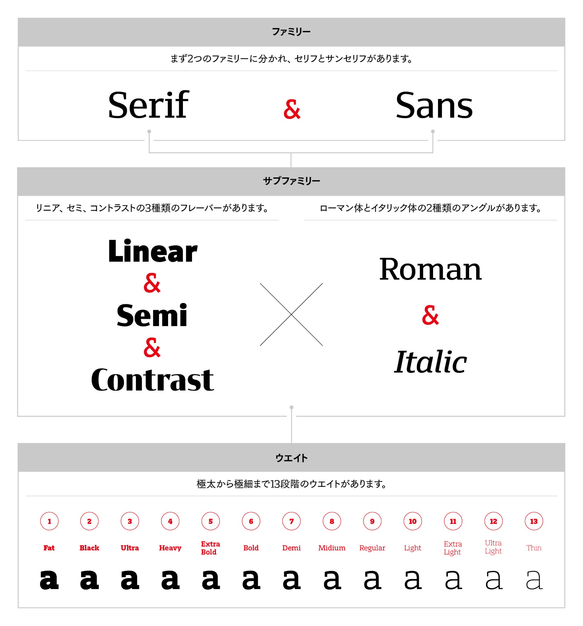 各ファミリーが13ウエイトで展開され、それぞれにローマン体とイタリック体の2アングルを用意しています。