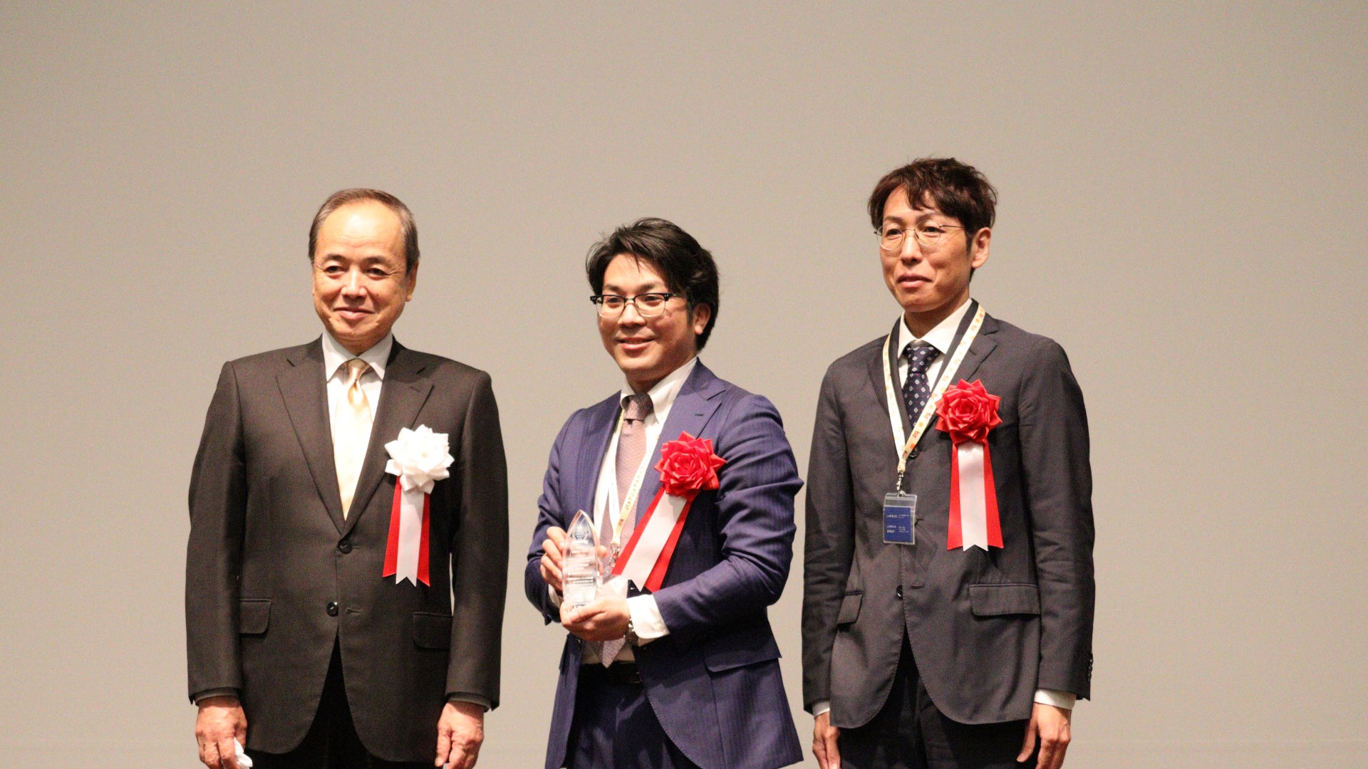 テレワーク推進賞表彰式(1/11実施)(左:日本テレワーク協会会長 栗原 博氏、中央:LAPRAS 代表取締役 染谷 健太郎、右:労務責任者 竹内 巌)