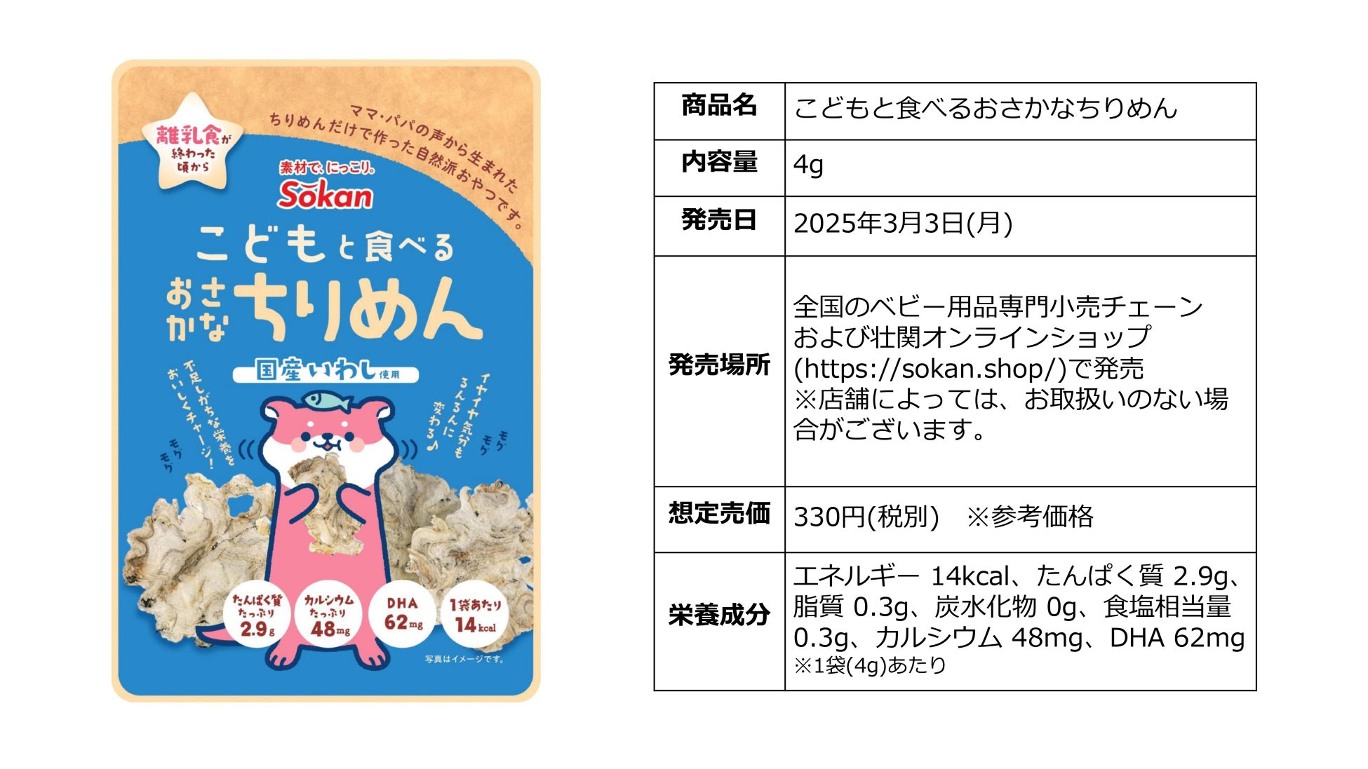 株式会社壮関(本社:栃木県矢板市 代表取締役社長:板山 健一)は、新商品『こどもと食べるおさかなちりめん』を2025年3月3日(月)より全国のベビー用品専門小売チェーンおよび壮関オンラインショップ(https://sokan.shop/)で発売いたします。