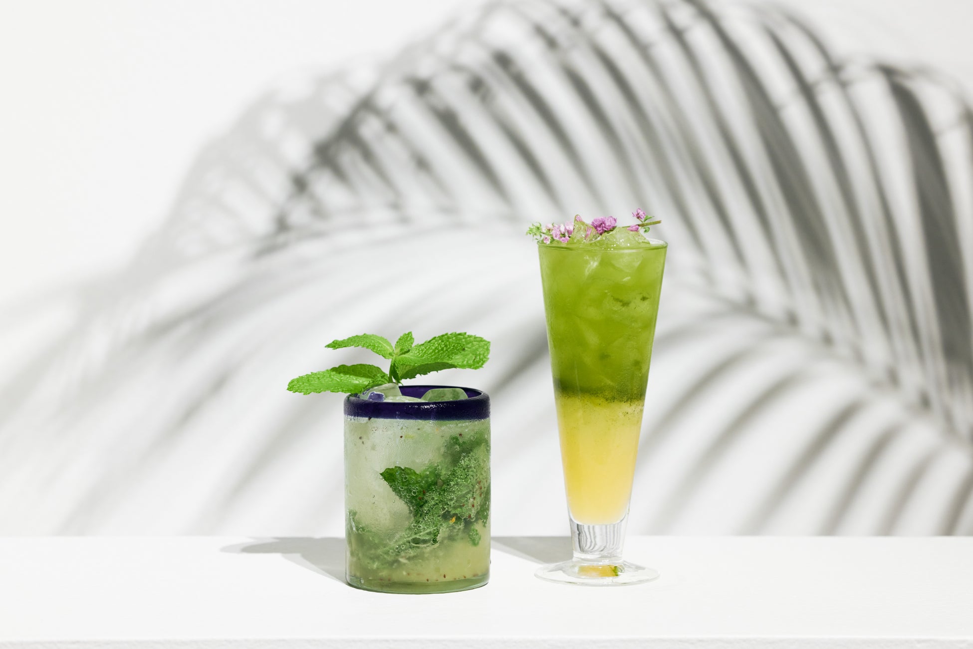 日中のカフェタイムには、趣向を凝らしたノンアルコールドリンクをご提供します。緑茶と自家製の白桃シロップを合わせた上品なピーチティー「風香桃(ふうかとう)」は、ガーニッシュに蕎麦茶をあしらうことで香ばしさを添えています。「GREENJITO(グリーンヒート)」は、ライムの皮をアップサイクルしたシロップにディルの香りを加え、ミントとキウイを合わせた清涼感あふれるノンアルコールモヒートです。