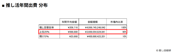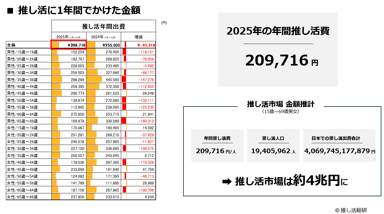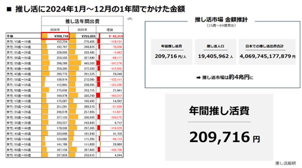 一方で今回の調査では、推し活人口が大幅に増加したにもかかわらず、推し活の年間出費額を見ると、全体平均は209,716円となり年間消費額は低下。市場全体の金額規模は拡大しているものの、前年の255,035円から減少しました。