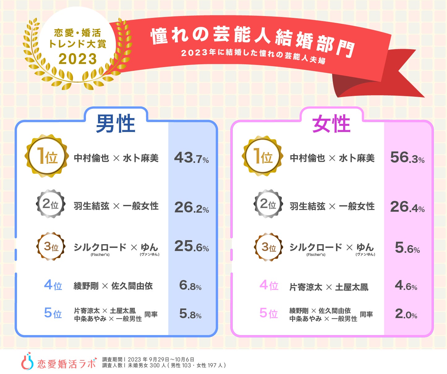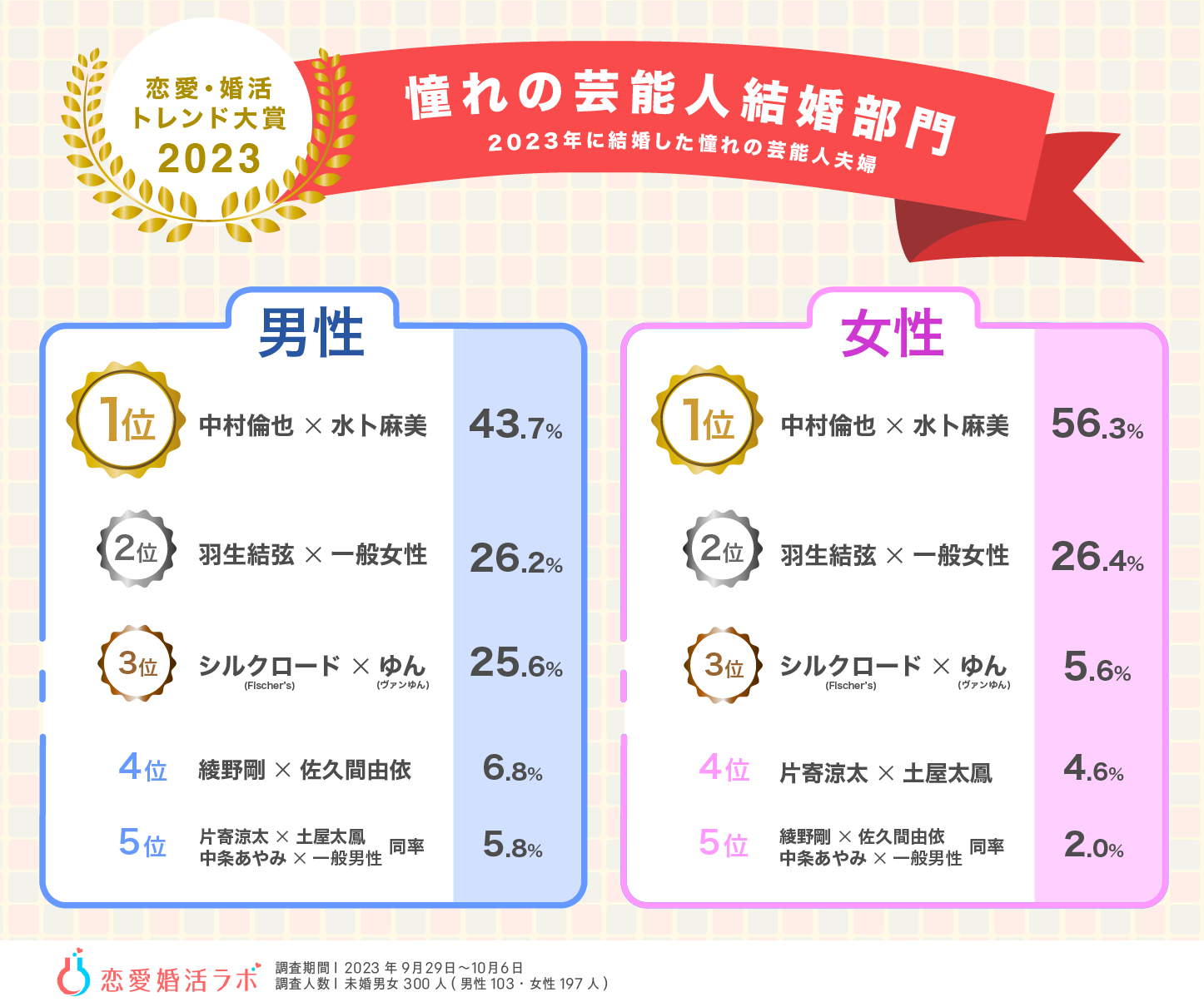 未婚男女300人(男性103人、女性197人)に、「2023年に結婚した芸能人の中で憧れのカップル」を調査したところ、男女共に第1位は「中村倫也×水卜麻美」カップルという結果になりました。回答した男女に理由を聞いたところ、「突然すぎてびっくりした」「結婚報道前に熱愛などのスクープも聞いたことがなく、でもとってもお似合いだから」(※一部抜粋)という意外な組み合わせによる驚きの意見が多く寄せられました。
