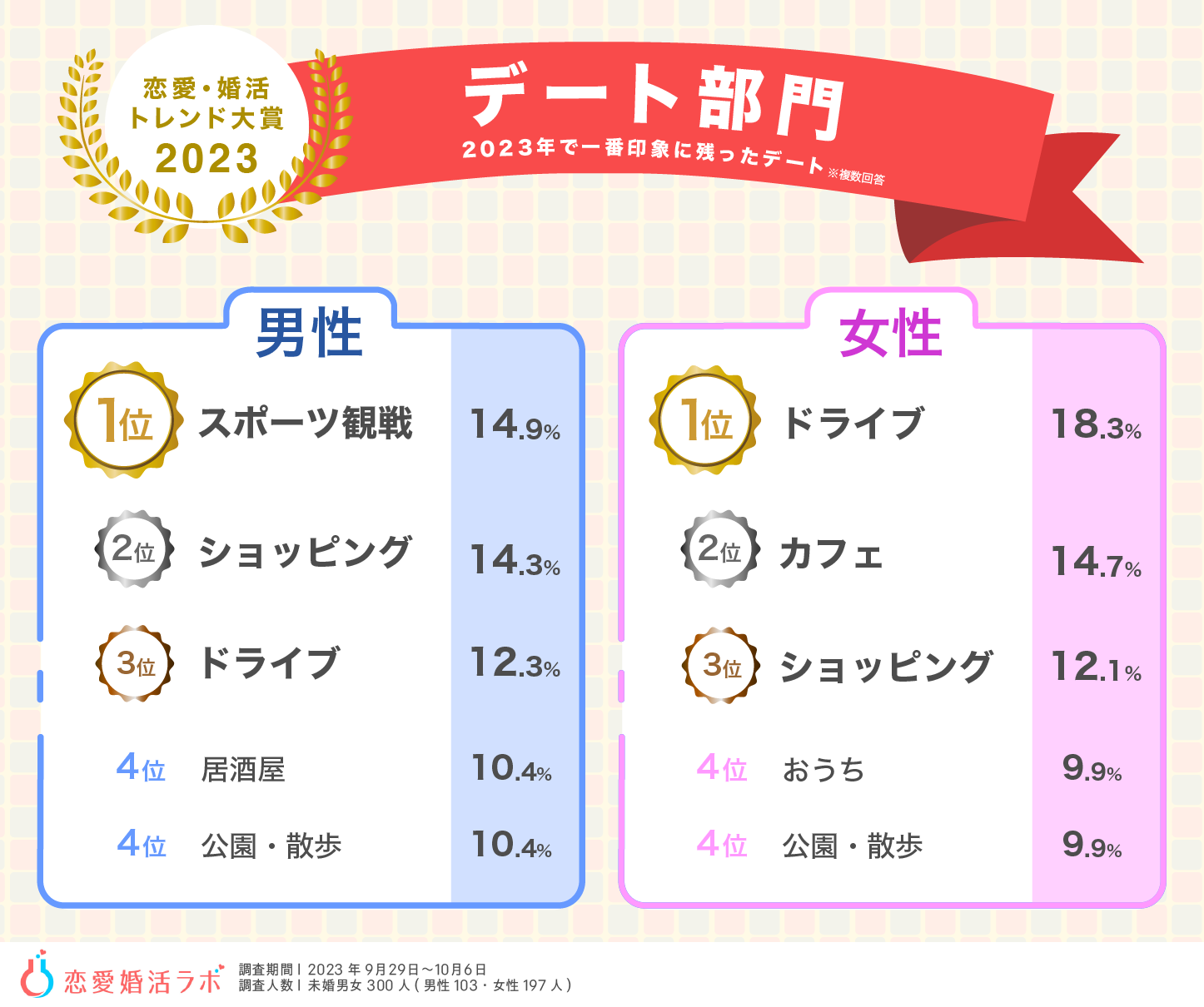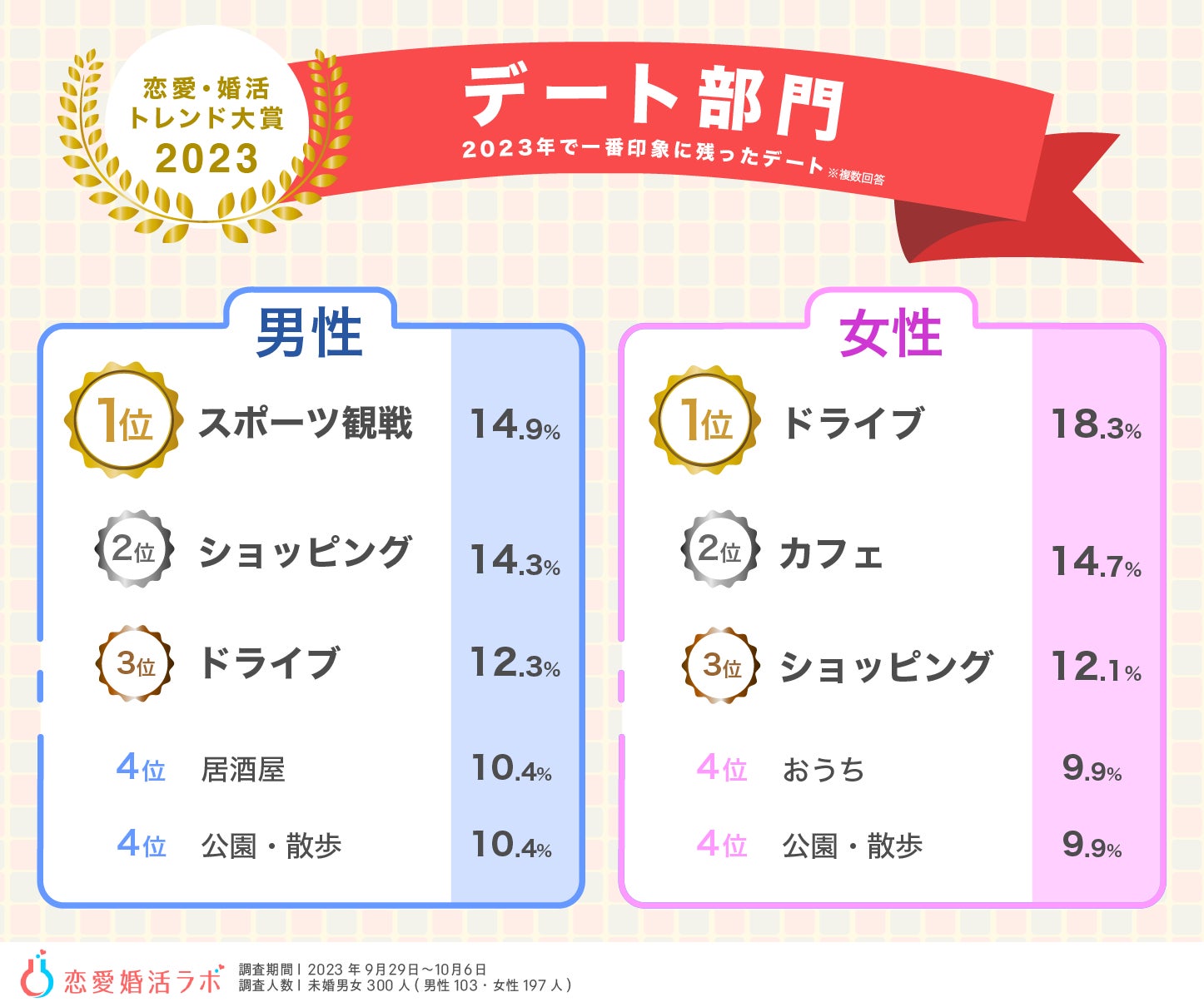 未婚男女300人(男性103人、女性197人)に「2023年で1番印象に残ったデート」について調査したところ、男性の第1位は「スポーツ観戦デート」、女性の第1位は「ドライブデート」でした。