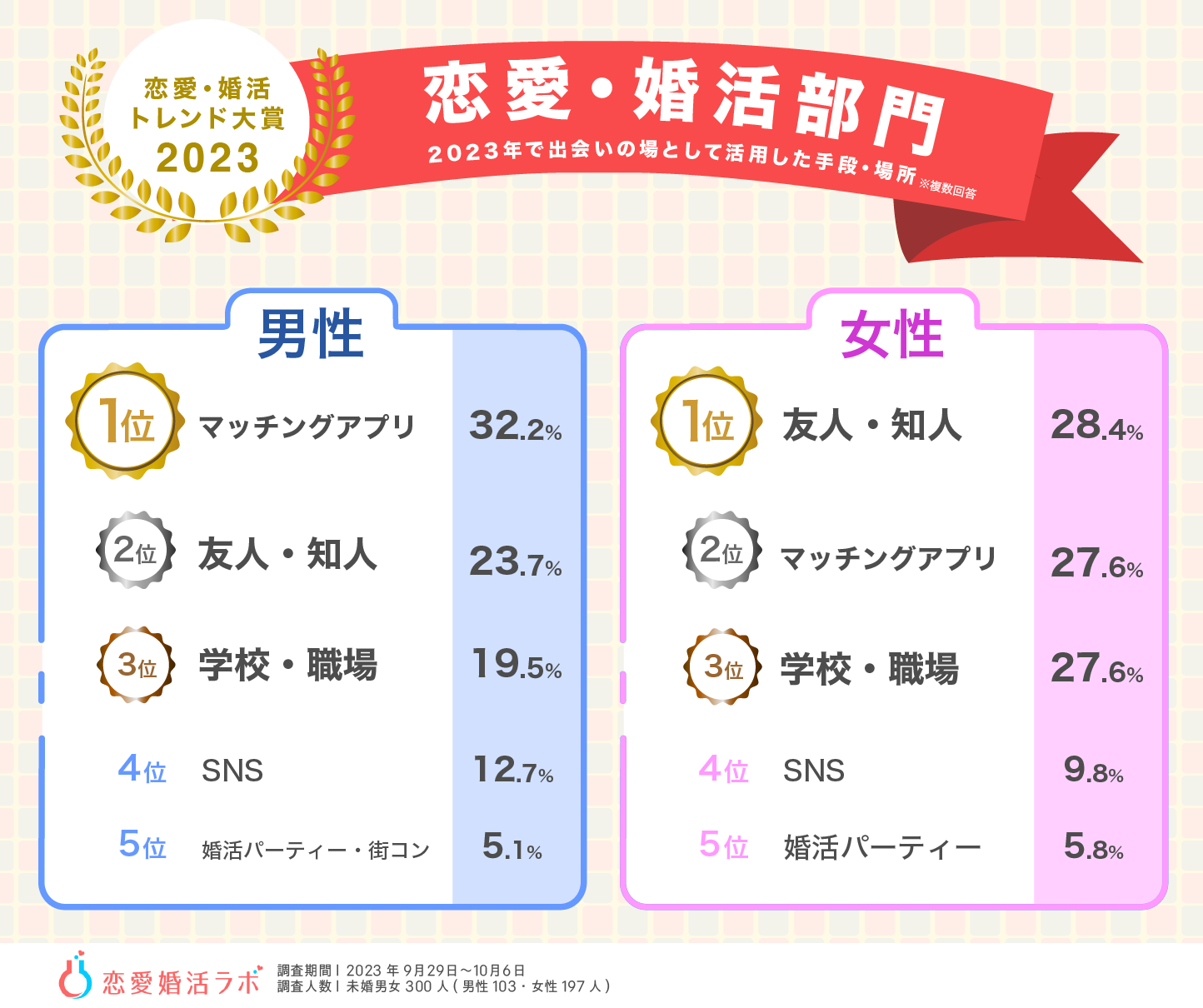未婚男女300人(男性103人、女性197人)に、「2023年に出会いの場として活用した手段・場所」について調査したところ、男性の第1位は「マッチングアプリ」、女性の第1位は「友人・知人」という結果になりました。