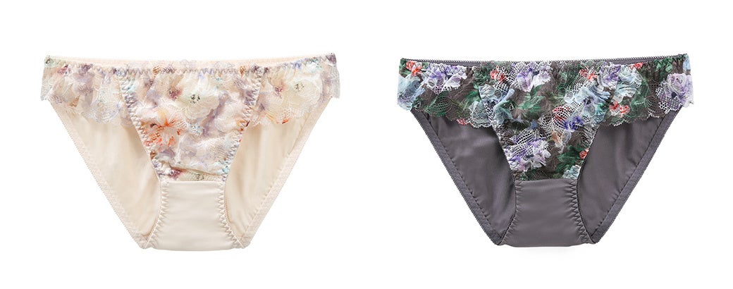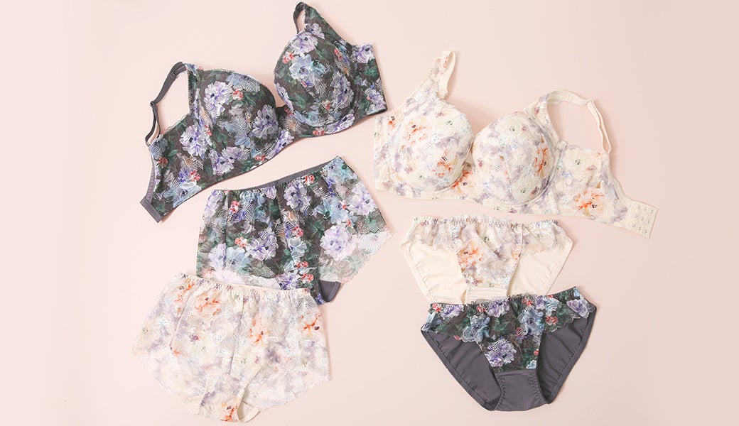 ブラサイズだけでなく、ショーツサイズも幅広く展開。プリントレースにこころ華やぐ、大人可愛いデザインに。
