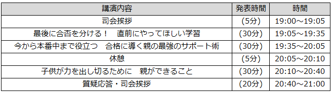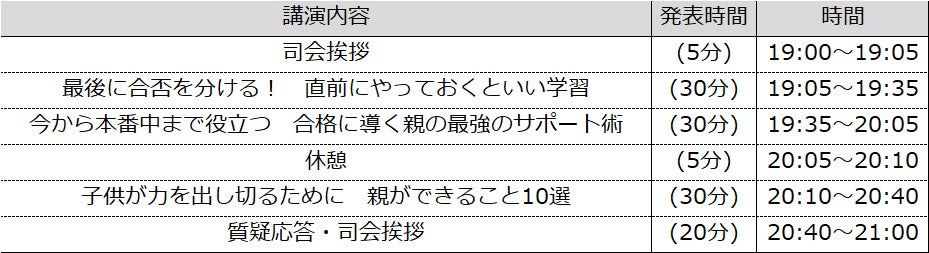 お二人に対談していただき、子供のタイプ別に最後の頑張りを引き出す声かけや応援方法をお伝えします。またさまざまな受験をサポートしてきたお二人に、入試直前期にありがちなトラブル事例について教えてもらいます。直前期の不安が解消する内容です。