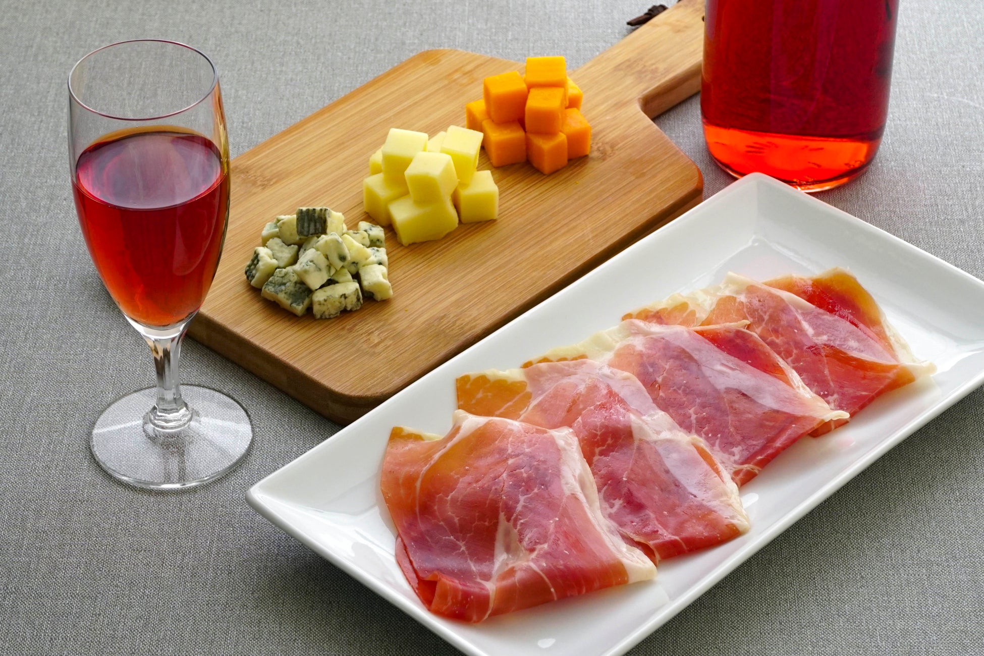 ピュアな酸味と果実風味が特長の辛口ロゼワイン。①ワインと色味の似た食材は相性が良いと言われています。ロゼワインの甘い香りと程よいボリュームが生ハムの塩気とよく合い、旨みをさらに引き立てます。②フランス産のブルーチーズ、ムールドベサック、ミモレットの3種をアソート。既にダイス状にカットされているため、お手軽アペリティーヴォにはぴったりです。凝縮したチーズの旨みがロゼワインの果実風味と調和して豊かな味わいに。