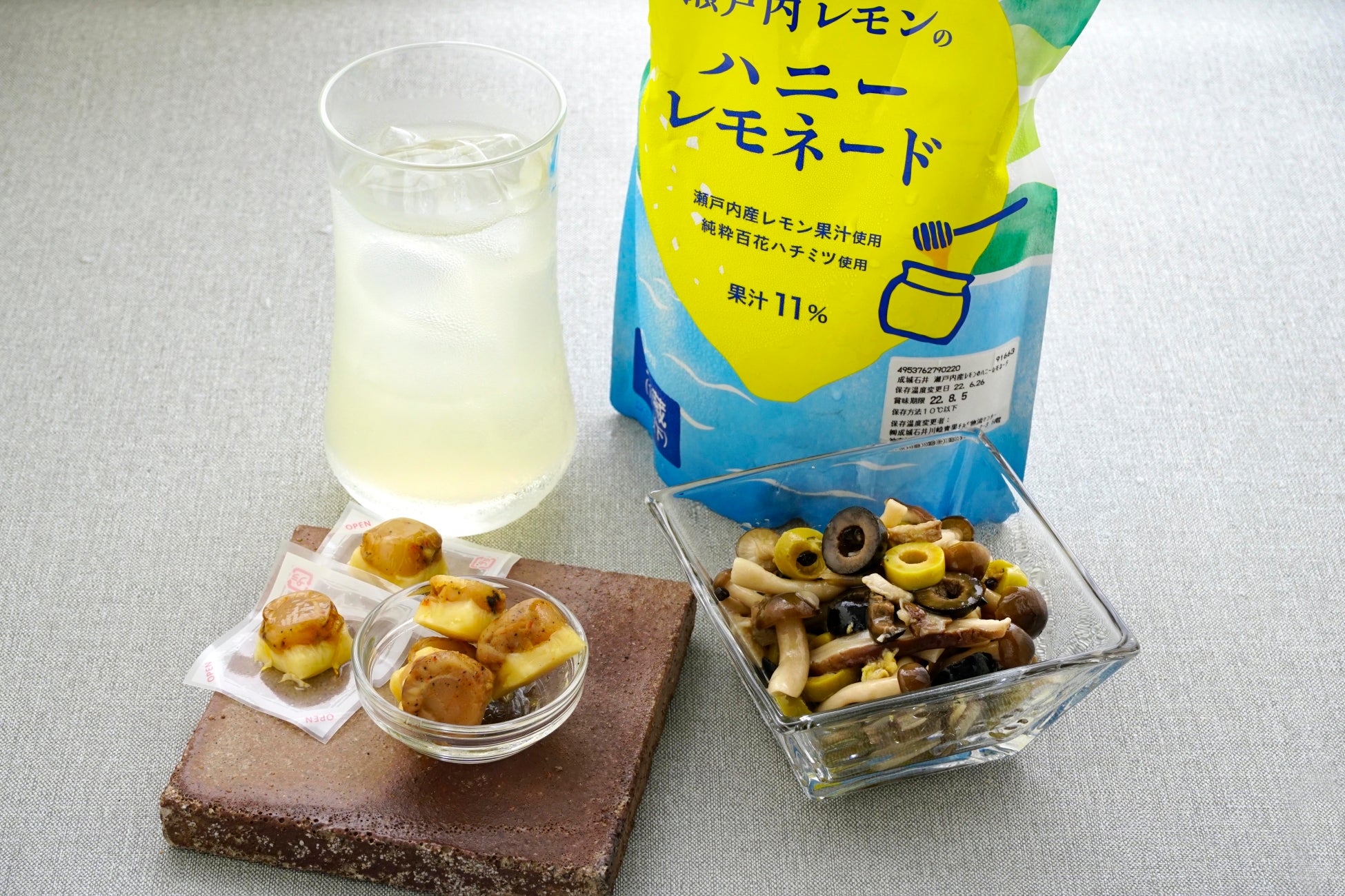 瀬戸内レモンのストレート果汁と純粋百花はちみつを使用した、爽やかで風味豊かなレモネード。魚料理や肉料理まで、どんな料理にもよく合います。①エリンギ・ぶなしめじ・舞茸・マッシュルーム・シイタケとオリーブのマリネ。マリネとレモネード、それぞれの優しい酸味と甘みがお互いを引き立てまろやかに調和します。②北海道噴火湾産のほたてを使用したほたてチーズは、アヒージョ風味でアクセントのある味わい。ほたてチーズのピリッとしたスパイス感が、爽やかな飲み口のレモネードと相性抜群です。