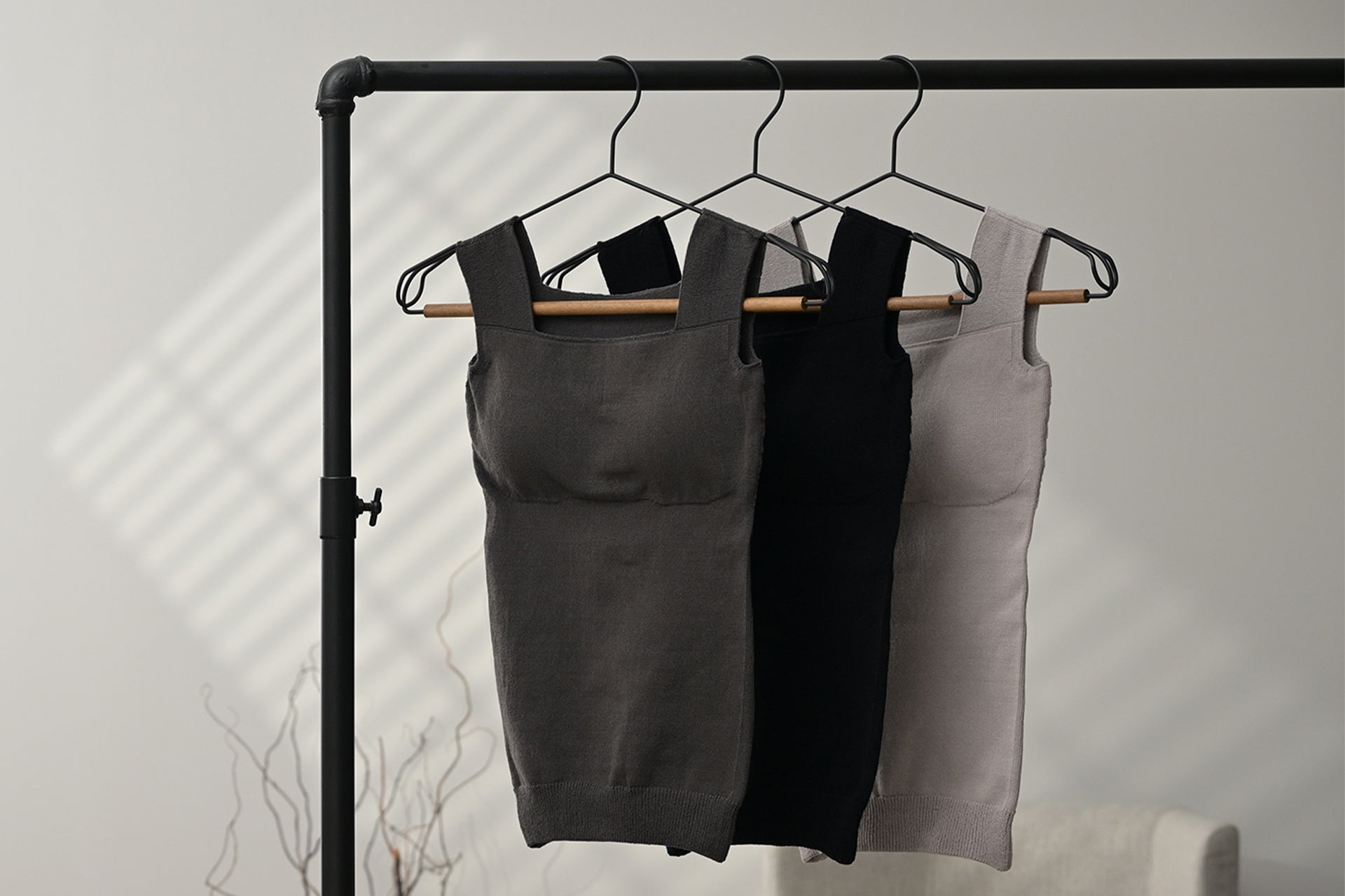 カップ付き仕様で、左右つながった挿入パッドがバストラインをきれいに整えます。縫い目がないホールガーメント®を採用し、肌ストレスを感じにくく、毎日の快適な温活をサポート。