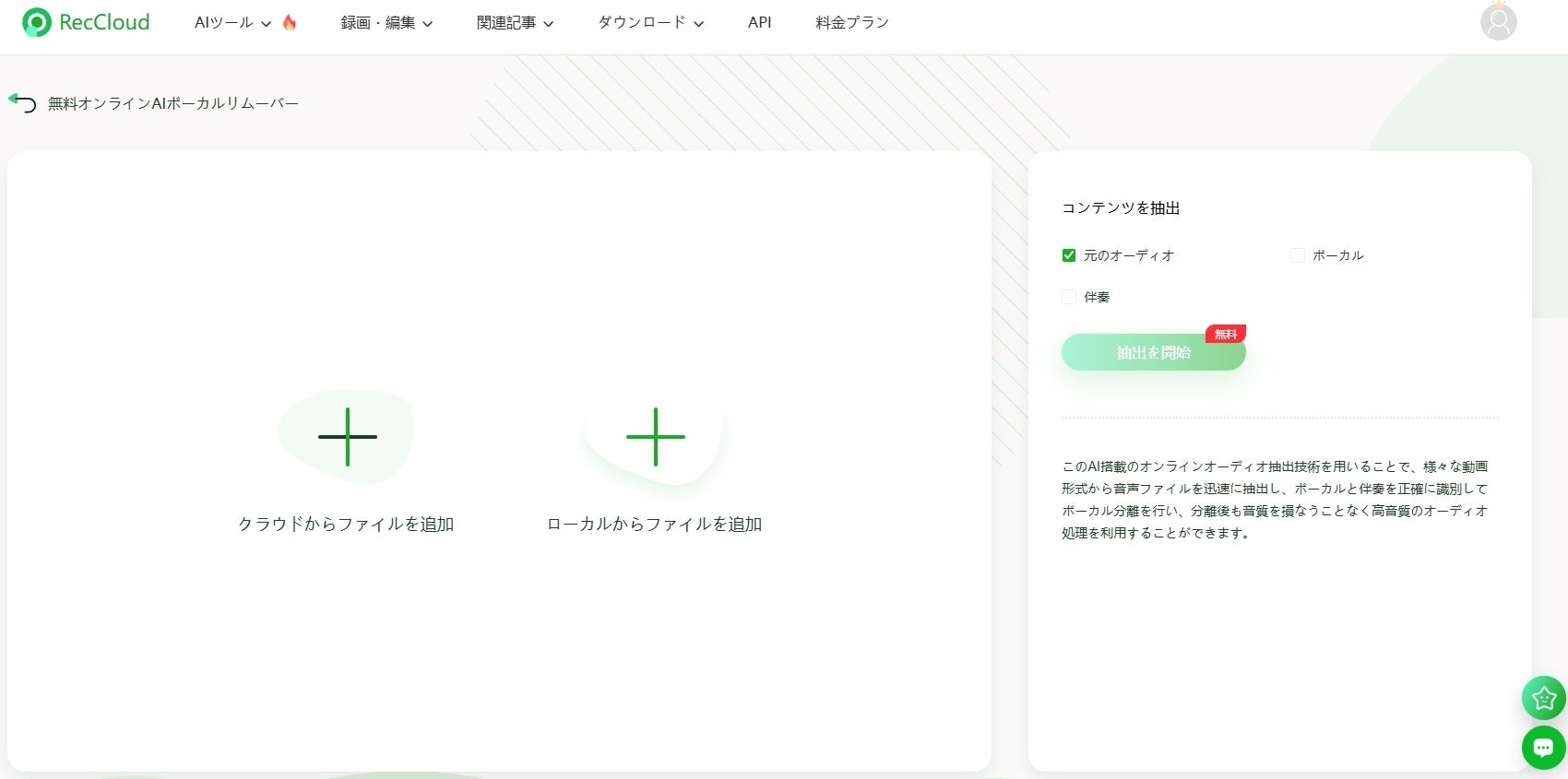 使用する方法はきわめて簡単です。ローカルファイルから音声・動画ファイルをアップロードしたり、またはRecCloudのクラウドファイルから指定したりして、無料オンラインAIボーカルリムーバーにインポートして、抽出したいコンテンツを「元のオーディオ」(動画から音声を取り出す場合はこれ)、「ボーカル」と「伴奏」から必要なものを選んで(複数選択可)、「抽出を開始」ボタンをクリックすればいいです。