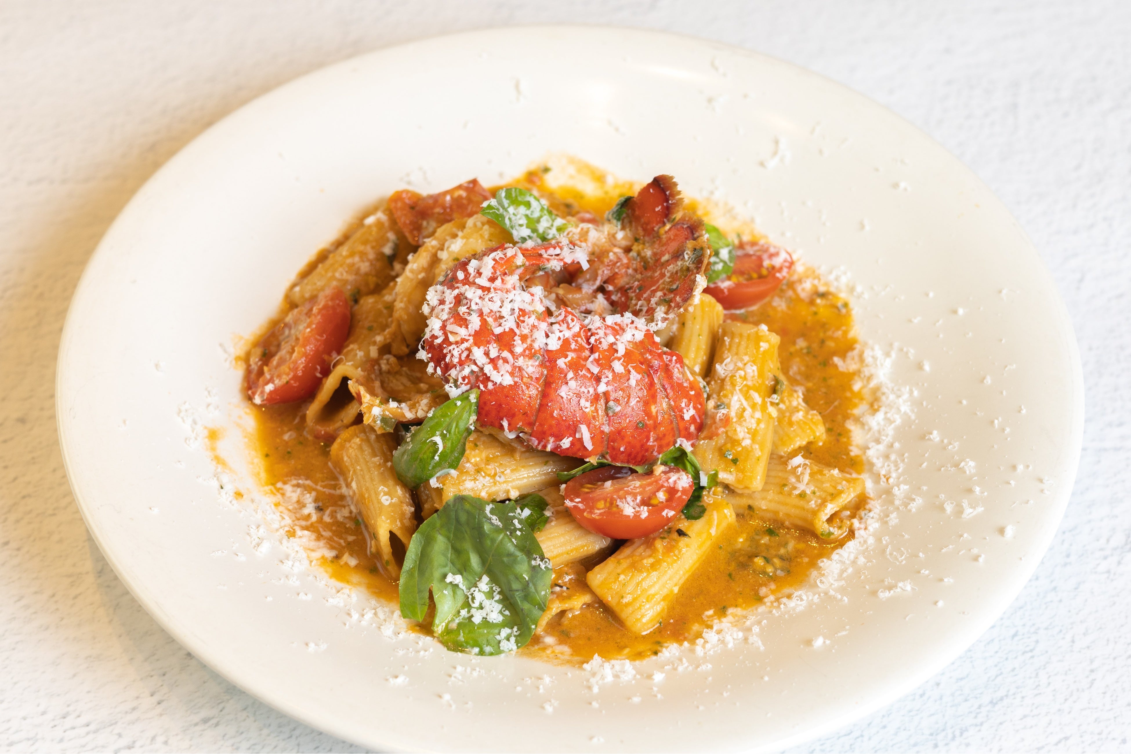 ▼オマール海老とフレッシュトマトのリガトーニ ペスト・トラパネーゼとバジル