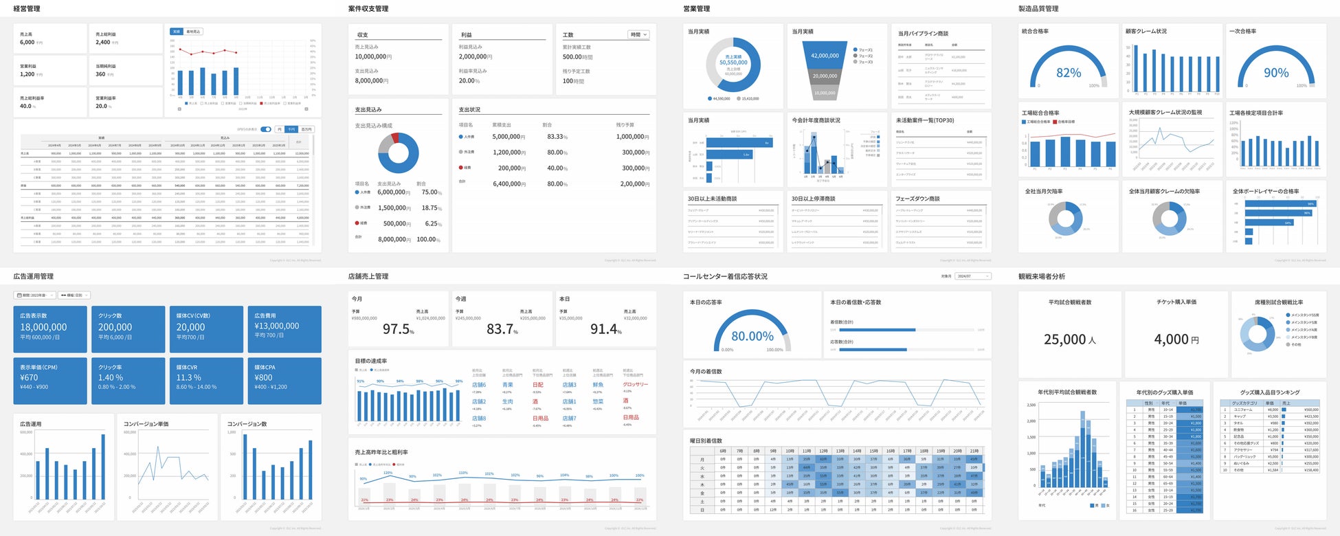 経営管理、案件収支管理、プロジェクト収支管理、営業管理、製造品質管理、広告運用管理、店舗売上管理、コールデンター応対状況管理、スポーツビジネス数値管理、など、ご要望に応じて、現在のデータ状態を把握させていただいた上で、適切なレイアウトをご提案させていただきます。