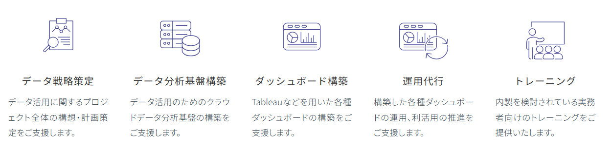 データ活用の方針策定からプロセス検討、ソリューション導入・定着化までワンストップでご支援いたします。