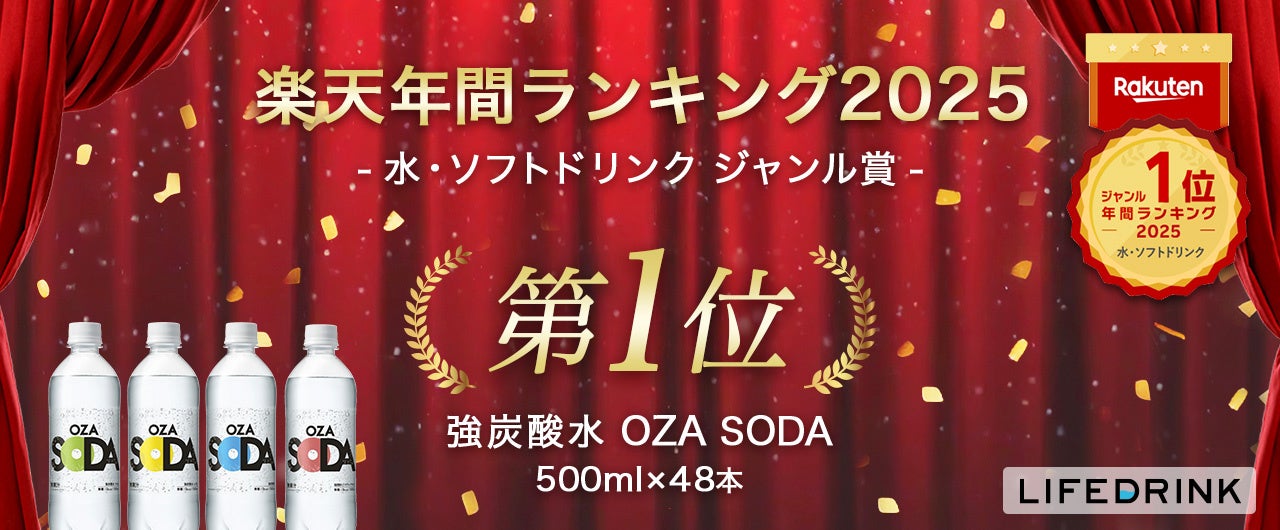 株式会社ライフドリンク カンパニー(本社:大阪府大阪市、代表取締役社長:岡野 邦昭)(以下「当社」)は、当社直営店舗「LIFEDRINKオンラインストア 楽天市場店」で販売する「強炭酸水 OZA SODA 500ml 48本」が、このたび楽天年間ランキング2025において、「水・ソフトドリンクジャンル賞(水・ソフトドリンクジャンル第1位)」を受賞いたしましたので、お知らせいたします。