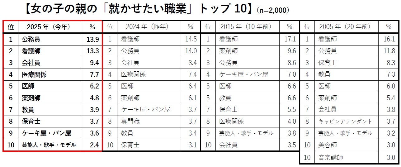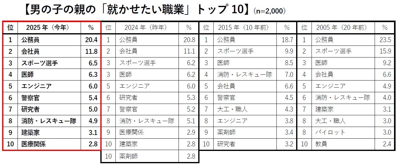 子どもの安定を願う気持ちは毎年変わらず、「公務員」が群を抜いて1位となりました。今年もポイントを伸ばした「会社員」は5年連続で2位。20年前と比べて倍近く増えている(6.6%→11.8%)ことからも、親からの人気が高まっていることがわかります。